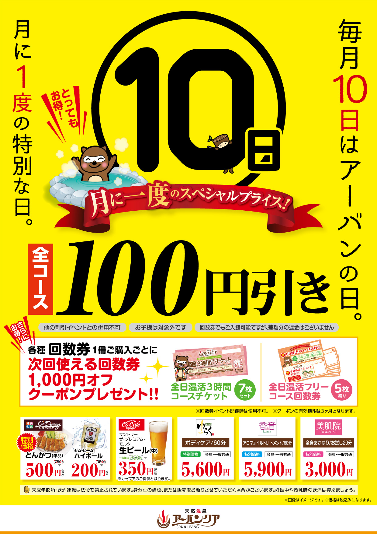 毎月10日は「アーバンの日」として、すべてのコースが100円引きに。