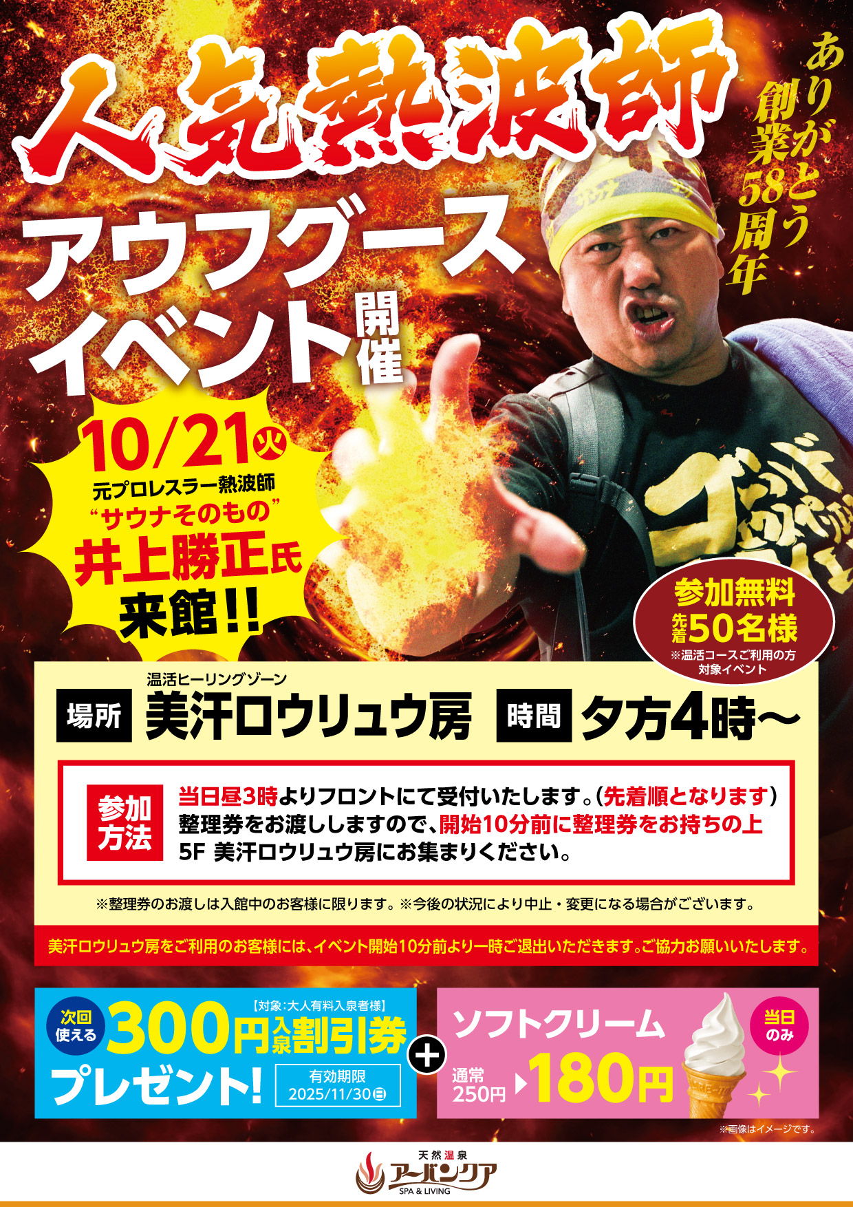 10月のアーバンクアは、銭湯の日の特別販売、平日岩盤浴スタンプラリー、ポン吉来店、そして創業58周年記念の熱波イベントと盛りだくさん!