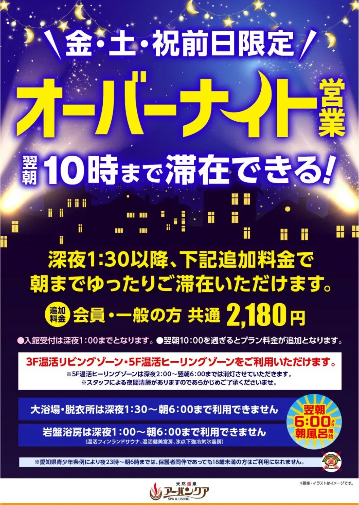 深夜1:30を過ぎると、会員・一般の方共通で 2,180円が自動で追加されます。