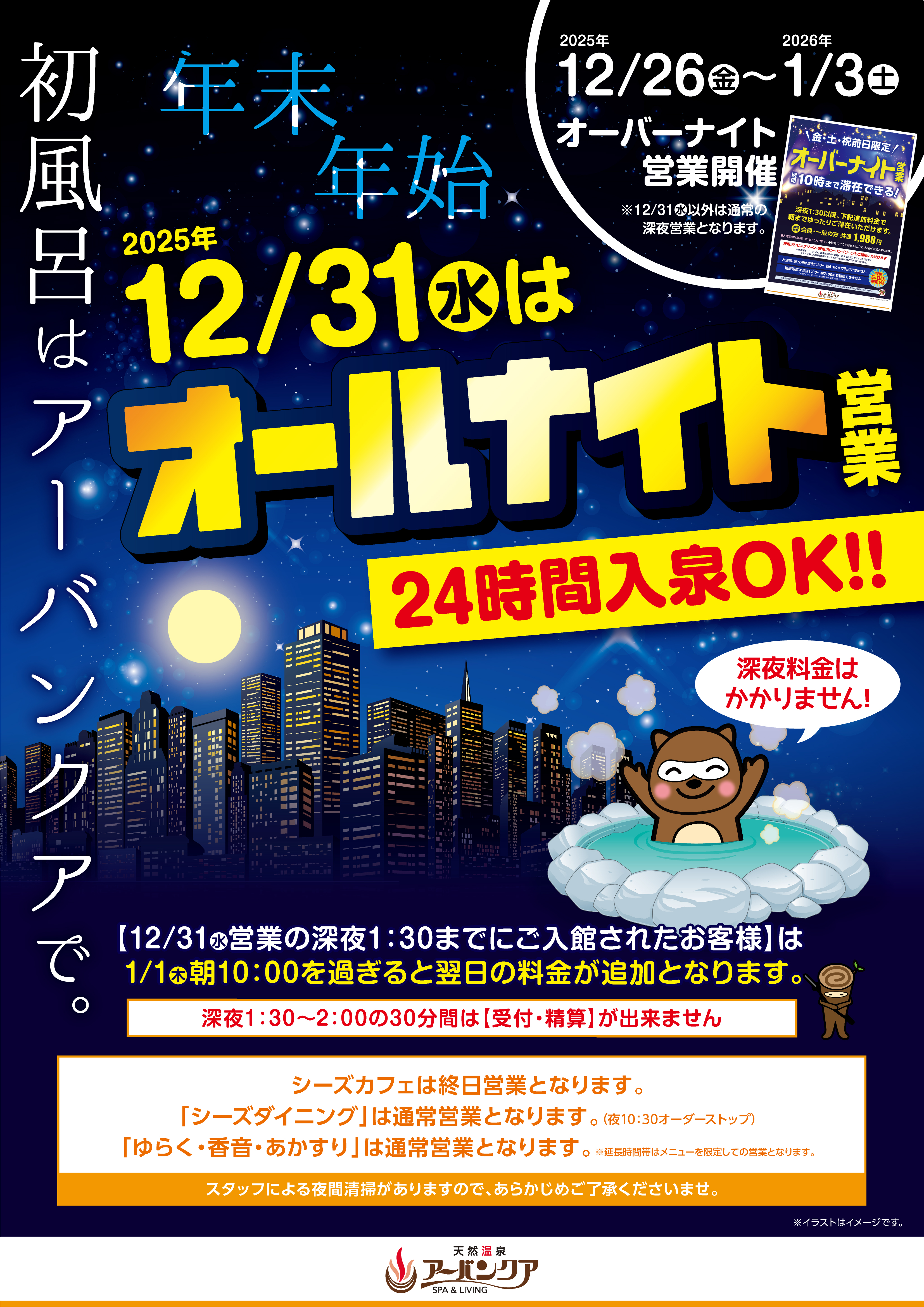 年末年始も休まず営業!12/31はアーバンクアでオールナイト温泉