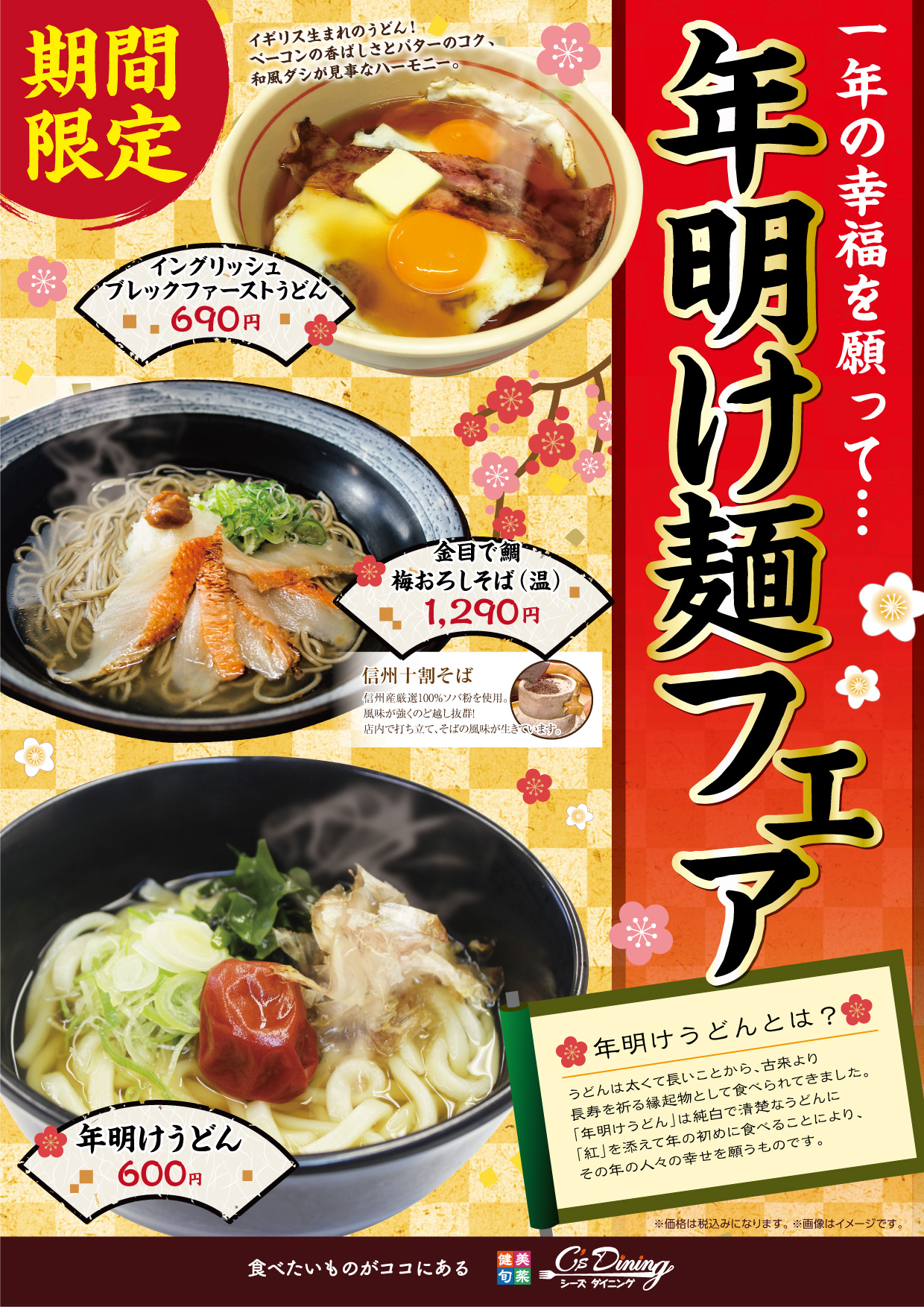 大晦日と新年には、シーズダイニングで年越しそば・年明け麺をご用意。