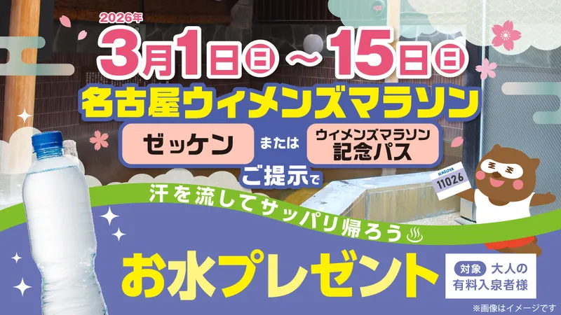 2026年3月1日(日)~15日(日)名古屋ウイメンズマラソン お水プレゼント 2026 2/27 お知らせ 2026年3月1日(日)~15日(日)名古屋ウイメンズマラソンの「ゼッケン」または「ウイメンズマラソン記念パス」ご提示でお水プレゼント! お知らせ 2026年2月17日(火) 館内にてテレビ撮影がございます 関連記事関連する記事はまだ見つかりませんでした。