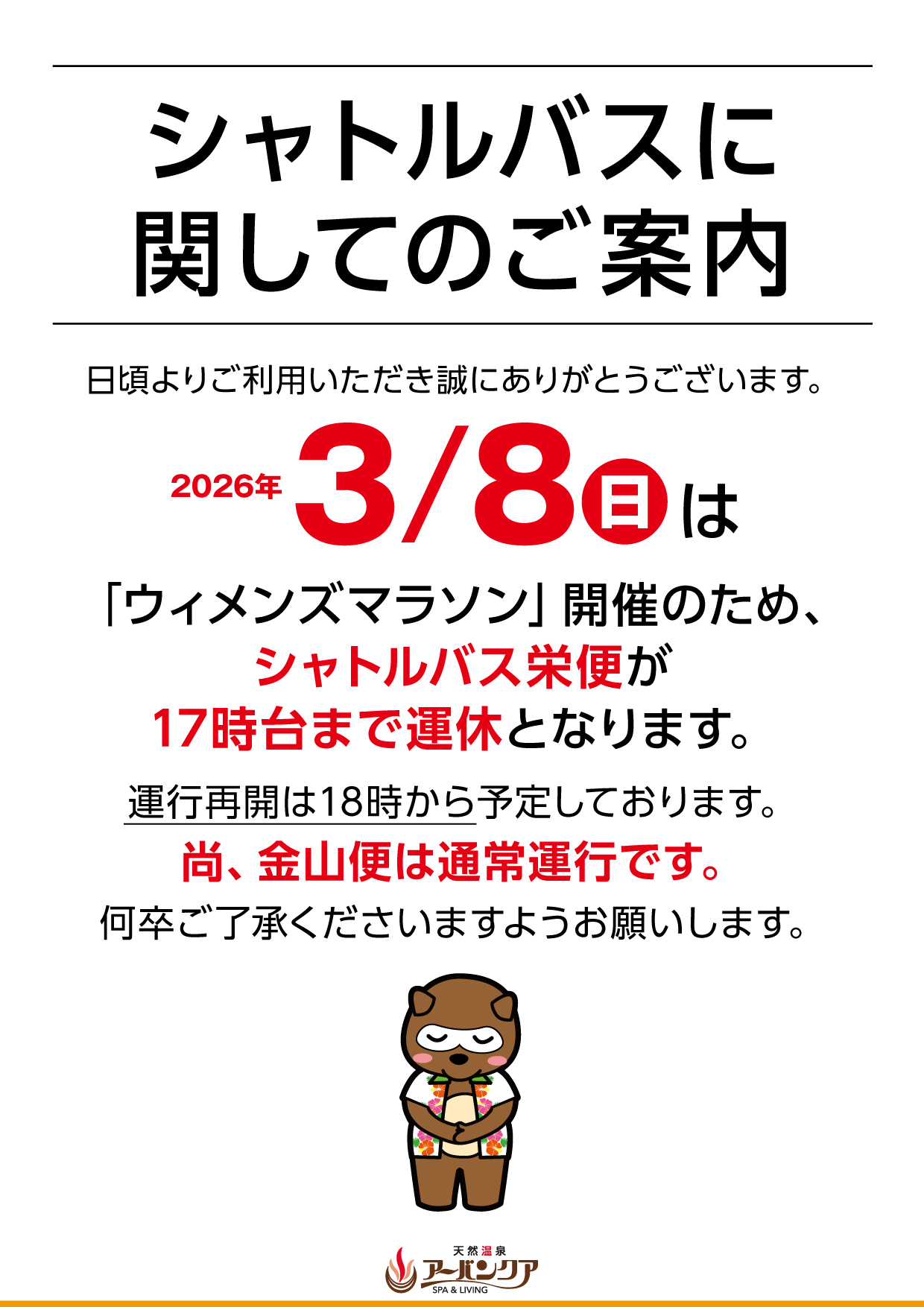 2026年3月8日(日) シャトルバスに関してのご案内 2026 3/06 お知らせ 2026年3月8日(日)は、シャトルバス栄便が17時まで運休となります。 何卒ご了承くださいますようお願いします。 お知らせ 2026年3月1日(日)~15日(日)名古屋ウイメンズマラソン お水プレゼント 関連記事関連する記事はまだ見つかりませんでした。