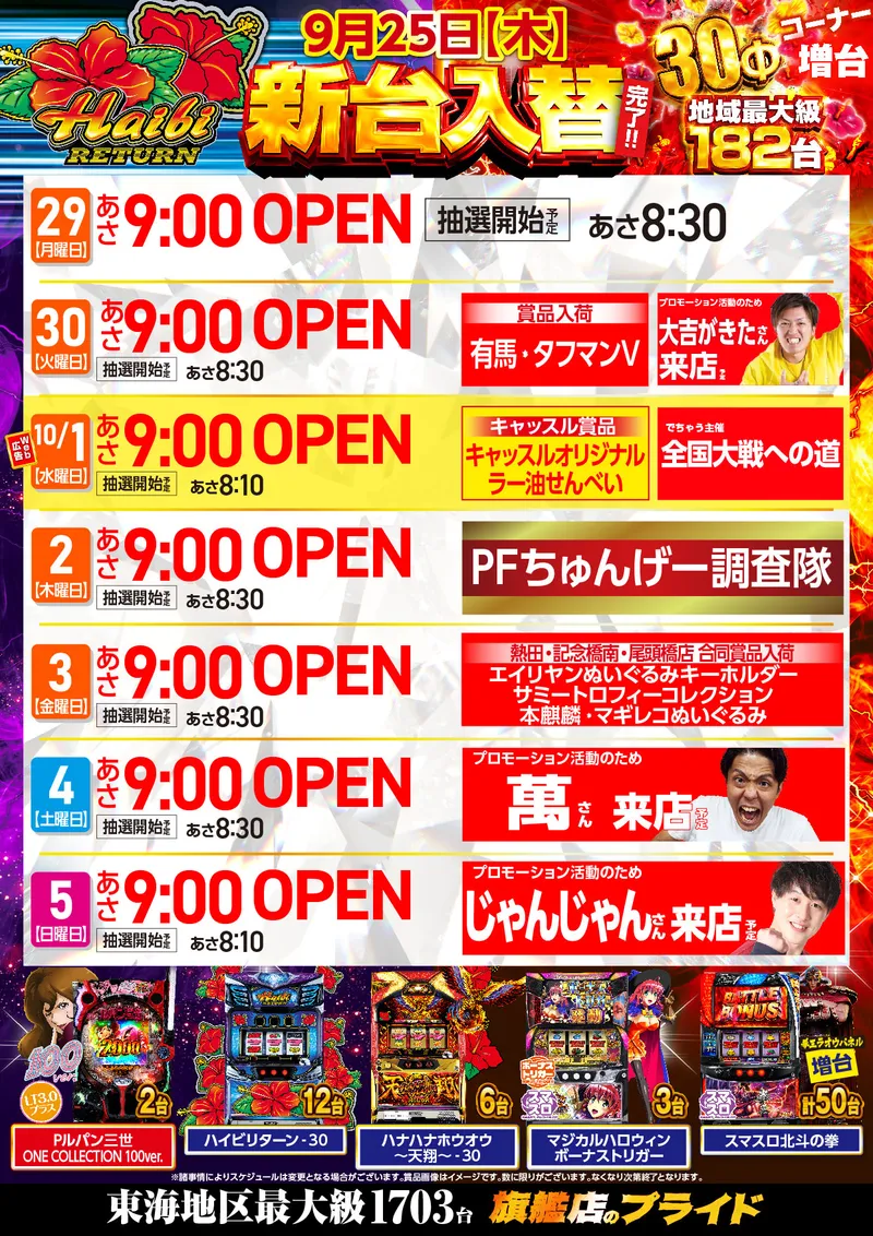 STORE INTRODUCTION 熱田店 NEW MACHINE 新台入替のご案内 9月25日(木)昼15時オープン! 16機種65台 一挙導入 SCHEDULE スケジュール キャッスルグループ全店10月8日水曜日朝9時オープン MENU 今月のメニュー 01 新台入替 これが最新導入機種だぁぁぁ! 02 オススメ機種 これが面白い!当店オススメはコレ! 03 機種ラインナップ 選べる楽しさ!設置機種情報はこちら! 04 ランキング&台データ 月間ランキングや当日データをチェック 05 入場方法 入場抽選時間や開店時間をチェック! 06 来店情報 有名人・インフルエンサー来店はこちら 07 厳選賞品・総付景品案内 厳選賞品や無料配布をGET! 08 ポイント景品入荷 ポイ活してゲット! 09 基本情報・アクセス Let′s Go! 10 設備・サービス 快適遊空間! 各店舗の最新情報やイメージキャラクター吉沢朱音の情報など盛り沢山でおとどけ! MENU メニュー 01 新台入替 02 オススメ機種 03 機種ラインナップ 04 ランキング&台データ 05 入場案内 06 来店情報 07 厳選賞品・総付景品案内 08 ポイント景品入荷 09 基本情報・アクセス 10 設備・サービス