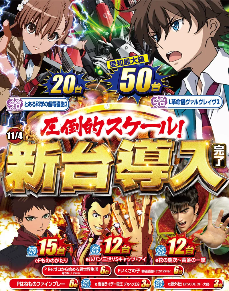 STORE INTRODUCTION 熱田店 NEW MACHINE 新台入替のご案内 11月4日(火)昼15時オープン! 11機種134台 一挙導入 SCHEDULE スケジュール キャッスルグループ全店11月5日水曜日朝9時オープン MENU 今月のメニュー 01 新台入替 これが最新導入機種だぁぁぁ! 02 オススメ機種 これが面白い!当店オススメはコレ! 03 機種ラインナップ 選べる楽しさ!設置機種情報はこちら! 04 ランキング&台データ 月間ランキングや当日データをチェック 05 入場方法 入場抽選時間や開店時間をチェック! 06 来店情報 有名人・インフルエンサー来店はこちら 07 厳選賞品・総付景品案内 厳選賞品や無料配布をGET! 08 ポイント景品入荷 ポイ活してゲット! 09 基本情報・アクセス Let′s Go! 10 設備・サービス 快適遊空間! 各店舗の最新情報やイメージキャラクター吉沢朱音の情報など盛り沢山でおとどけ! MENU メニュー 01 新台入替 02 オススメ機種 03 機種ラインナップ 04 ランキング&台データ 05 入場案内 06 来店情報 07 厳選賞品・総付景品案内 08 ポイント景品入荷 09 基本情報・アクセス 10 設備・サービス