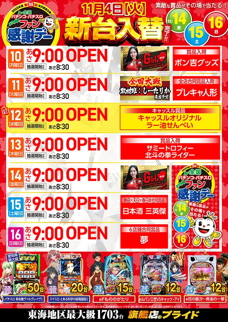 STORE INTRODUCTION 熱田店 NEW MACHINE 新台入替のご案内 11月4日(火)昼15時オープン! 11機種134台 一挙導入 SCHEDULE スケジュール キャッスルグループ全店11月12日水曜日朝9時オープン MENU 今月のメニュー 01 新台入替 これが最新導入機種だぁぁぁ! 02 オススメ機種 これが面白い!当店オススメはコレ! 03 機種ラインナップ 選べる楽しさ!設置機種情報はこちら! 04 ランキング&台データ 月間ランキングや当日データをチェック 05 入場方法 入場抽選時間や開店時間をチェック! 06 来店情報 有名人・インフルエンサー来店はこちら 07 厳選賞品・総付景品案内 厳選賞品や無料配布をGET! 08 ポイント景品入荷 ポイ活してゲット! 09 基本情報・アクセス Let′s Go! 10 設備・サービス 快適遊空間! 各店舗の最新情報やイメージキャラクター吉沢朱音の情報など盛り沢山でおとどけ! MENU メニュー 01 新台入替 02 オススメ機種 03 機種ラインナップ 04 ランキング&台データ 05 入場案内 06 来店情報 07 厳選賞品・総付景品案内 08 ポイント景品入荷 09 基本情報・アクセス 10 設備・サービス