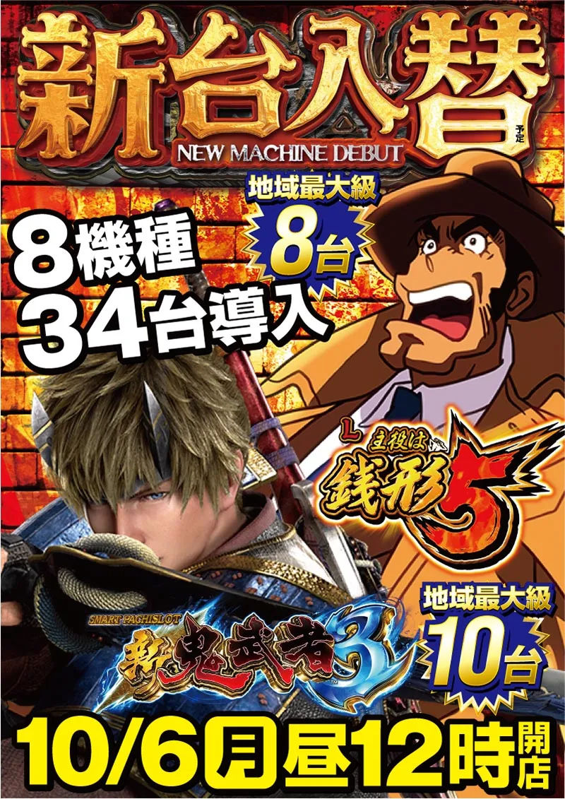 STORE INTRODUCTION 上社店 NEW MACHINE 新台入替のご案内 10月6日(月)昼12時オープン! 8機種34台 一挙導入 SCHEDULE スケジュール キャッスルグループ全店10月8日水曜日朝9時オープン MENU 今月のメニュー 01 新台入替 これが最新導入機種だぁぁぁ! 02 オススメ機種 これが面白い!当店オススメはコレ! 03 機種ラインナップ 選べる楽しさ!設置機種情報はこちら! 04 台データ 当日データをチェック 05 入場方法 入場抽選時間や開店時間をチェック! 06 来店情報 有名人・インフルエンサー来店はこちら 07 厳選賞品・総付景品案内 厳選賞品や無料配布をGET! 08 ポイント景品入荷 ポイ活してゲット! 09 基本情報・アクセス Let′s Go! 10 設備・サービス 快適遊空間! 各店舗の最新情報やイメージキャラクター吉沢朱音の情報など盛り沢山でおとどけ! MENU メニュー 01 新台入替 02 オススメ機種 03 機種ラインナップ 04 台データ 05 入場案内 06 来店情報 07 厳選賞品・総付景品案内 08 ポイント景品入荷 09 基本情報・アクセス 10 設備・サービス