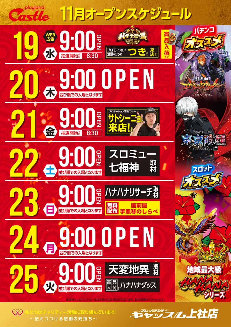 STORE INTRODUCTION 上社店 NEW MACHINE 新台入替のご案内 11月17日(月)昼12時オープン! 9機種17台 一挙導入 SCHEDULE スケジュール キャッスルグループ全店11月26日水曜日朝9時オープン MENU 今月のメニュー 01 新台入替 これが最新導入機種だぁぁぁ! 02 オススメ機種 これが面白い!当店オススメはコレ! 03 機種ラインナップ 選べる楽しさ!設置機種情報はこちら! 04 台データ 当日データをチェック 05 入場方法 入場抽選時間や開店時間をチェック! 06 来店情報 有名人・インフルエンサー来店はこちら 07 厳選賞品・総付景品案内 厳選賞品や無料配布をGET! 08 ポイント景品入荷 ポイ活してゲット! 09 基本情報・アクセス Let′s Go! 10 設備・サービス 快適遊空間! 各店舗の最新情報やイメージキャラクター吉沢朱音の情報など盛り沢山でおとどけ! MENU メニュー 01 新台入替 02 オススメ機種 03 機種ラインナップ 04 台データ 05 入場案内 06 来店情報 07 厳選賞品・総付景品案内 08 ポイント景品入荷 09 基本情報・アクセス 10 設備・サービス