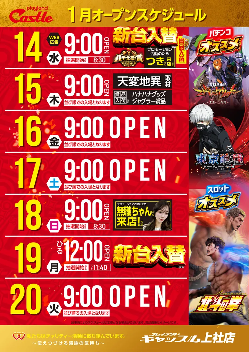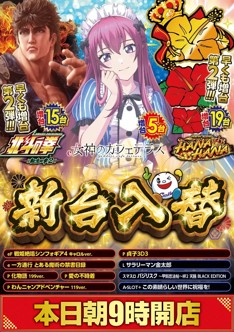 STORE INTRODUCTION 上社店 NEW MACHINE 新台入替のご案内 1月14日(月)朝9時オープン! 12機種24台 一挙導入(予定) SCHEDULE スケジュール キャッスルグループ全店1月21日水曜日朝9時オープン MENU 今月のメニュー 01 新台入替 これが最新導入機種だぁぁぁ! 02 オススメ機種 これが面白い!当店オススメはコレ! 03 機種ラインナップ 選べる楽しさ!設置機種情報はこちら! 04 台データ 当日データをチェック 05 入場方法 入場抽選時間や開店時間をチェック! 06 来店情報 有名人・インフルエンサー来店はこちら 07 厳選賞品・総付景品案内 厳選賞品や無料配布をGET! 08 ポイント景品入荷 ポイ活してゲット! 09 基本情報・アクセス Let′s Go! 10 設備・サービス 快適遊空間! 各店舗の最新情報やイメージキャラクター吉沢朱音の情報など盛り沢山でおとどけ! MENU メニュー 01 新台入替 02 オススメ機種 03 機種ラインナップ 04 台データ 05 入場案内 06 来店情報 07 厳選賞品・総付景品案内 08 ポイント景品入荷 09 基本情報・アクセス 10 設備・サービス