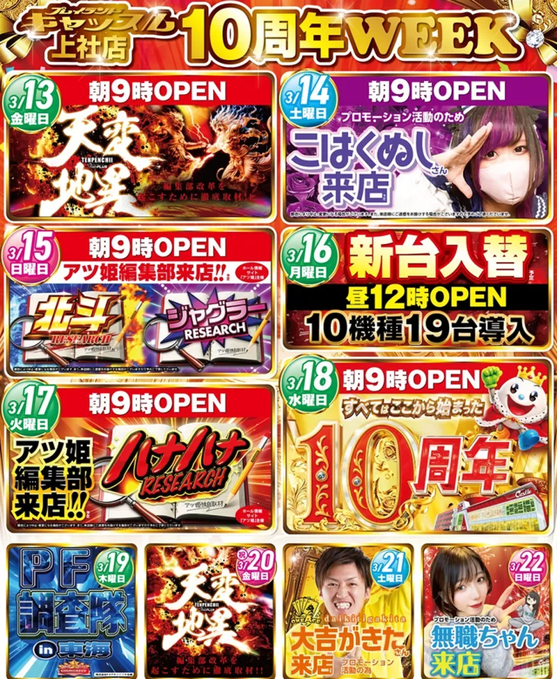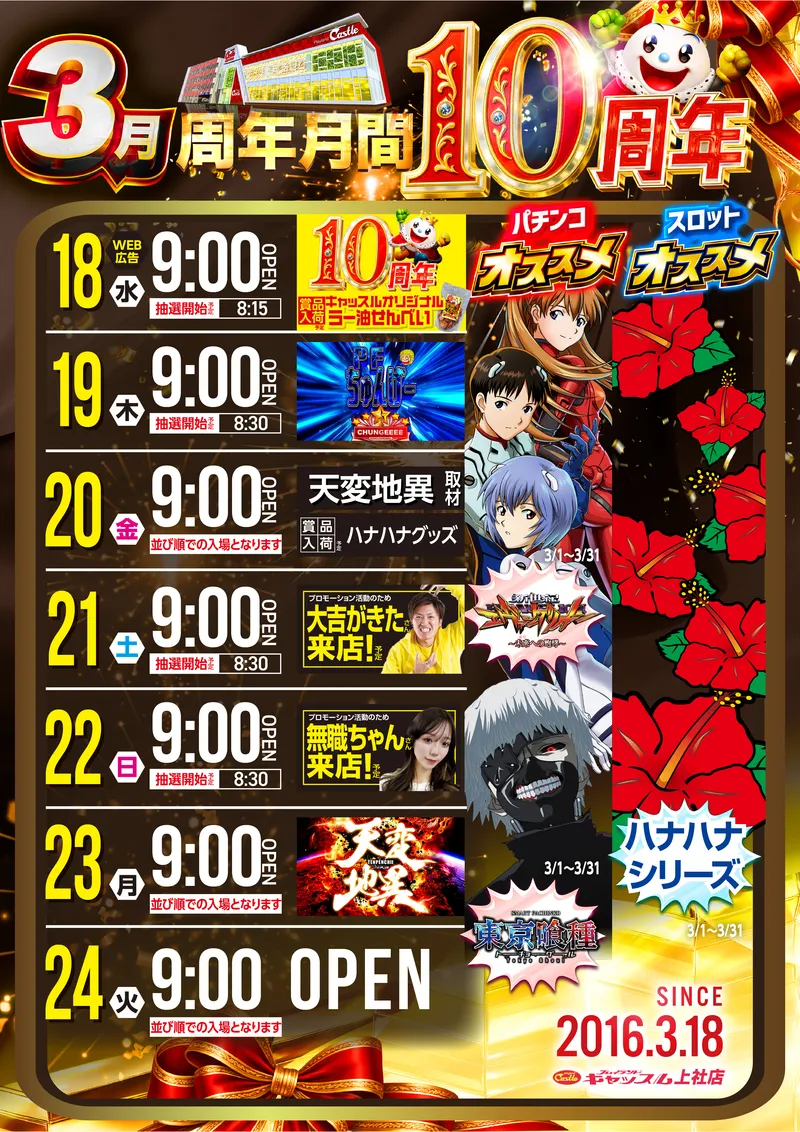 STORE INTRODUCTION 上社店 NEW MACHINE 新台入替のご案内 3月16日(月)昼12時オープン! 10機種19台 一挙導入(予定) SCHEDULE スケジュール キャッスルグループ全店3月25日水曜日朝9時オープン MENU 今月のメニュー 01 新台入替 これが最新導入機種だぁぁぁ! 02 オススメ機種 これが面白い!当店オススメはコレ! 03 機種ラインナップ 選べる楽しさ!設置機種情報はこちら! 04 台データ 当日データをチェック 05 入場方法 入場抽選時間や開店時間をチェック! 06 来店情報 有名人・インフルエンサー来店はこちら 07 厳選賞品・総付景品案内 厳選賞品や無料配布をGET! 08 ポイント景品入荷 ポイ活してゲット! 09 基本情報・アクセス Let′s Go! 10 設備・サービス 快適遊空間! 各店舗の最新情報やイメージキャラクター吉沢朱音の情報など盛り沢山でおとどけ! MENU メニュー 01 新台入替 02 オススメ機種 03 機種ラインナップ 04 台データ 05 入場案内 06 来店情報 07 厳選賞品・総付景品案内 08 ポイント景品入荷 09 基本情報・アクセス 10 設備・サービス