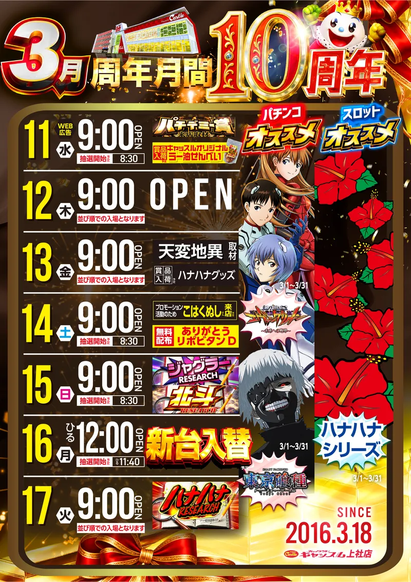 STORE INTRODUCTION 上社店 NEW MACHINE 新台入替のご案内 3月2日(月)昼12時オープン! 9機種26台 一挙導入(予定) SCHEDULE スケジュール キャッスルグループ全店3月18日水曜日朝9時オープン MENU 今月のメニュー 01 新台入替 これが最新導入機種だぁぁぁ! 02 オススメ機種 これが面白い!当店オススメはコレ! 03 機種ラインナップ 選べる楽しさ!設置機種情報はこちら! 04 台データ 当日データをチェック 05 入場方法 入場抽選時間や開店時間をチェック! 06 来店情報 有名人・インフルエンサー来店はこちら 07 厳選賞品・総付景品案内 厳選賞品や無料配布をGET! 08 ポイント景品入荷 ポイ活してゲット! 09 基本情報・アクセス Let′s Go! 10 設備・サービス 快適遊空間! 各店舗の最新情報やイメージキャラクター吉沢朱音の情報など盛り沢山でおとどけ! MENU メニュー 01 新台入替 02 オススメ機種 03 機種ラインナップ 04 台データ 05 入場案内 06 来店情報 07 厳選賞品・総付景品案内 08 ポイント景品入荷 09 基本情報・アクセス 10 設備・サービス