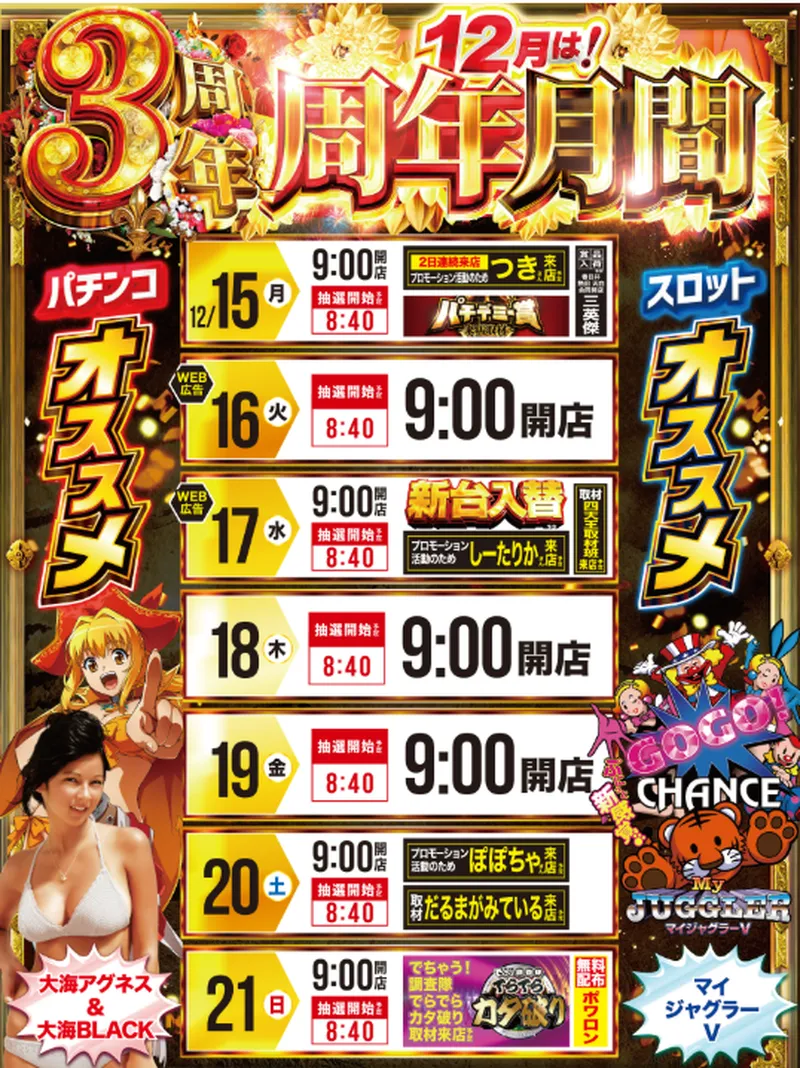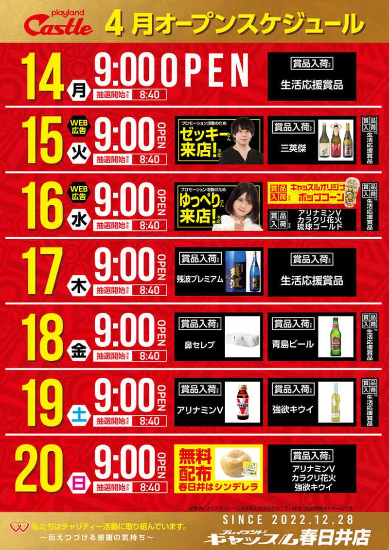 STORE INTRODUCTION 春日井店 NEW MACHINE 新台入替のご案内 12月17日(水)朝9時オープン! 10機種20台 一挙導入 SCHEDULE 賞品入荷スケジュール キャッスルグループ全店12月17日水曜日朝9時オープン MENU 今月のメニュー 01 新台入替 これが最新導入機種だぁぁぁ! 02 オススメ機種 これが面白い!当店オススメはコレ! 03 機種ラインナップ 選べる楽しさ!設置機種情報はこちら! 04 ランキング&台データ 月間ランキングや当日データをチェック 05 入場方法 入場抽選時間や開店時間をチェック! 06 来店情報 有名人・インフルエンサー来店はこちら 07 厳選賞品・総付景品案内 厳選賞品や無料配布をGET! 08 ポイント景品入荷 ポイ活してゲット! 09 屋台 嬉しい!楽しい!催し物いっぱい 10 基本情報・アクセス Let′s Go! 11 設備・サービス 快適遊空間! 各店舗の最新情報やイメージキャラクター吉沢朱音の情報など盛り沢山でおとどけ! MENU メニュー 01 新台入替 02 オススメ機種 03 機種ラインナップ 04 ランキング&台データ 05 入場案内 06 来店情報 07 厳選賞品・総付景品案内 08 ポイント景品入荷 09 屋台 10 基本情報・アクセス 11 設備・サービス