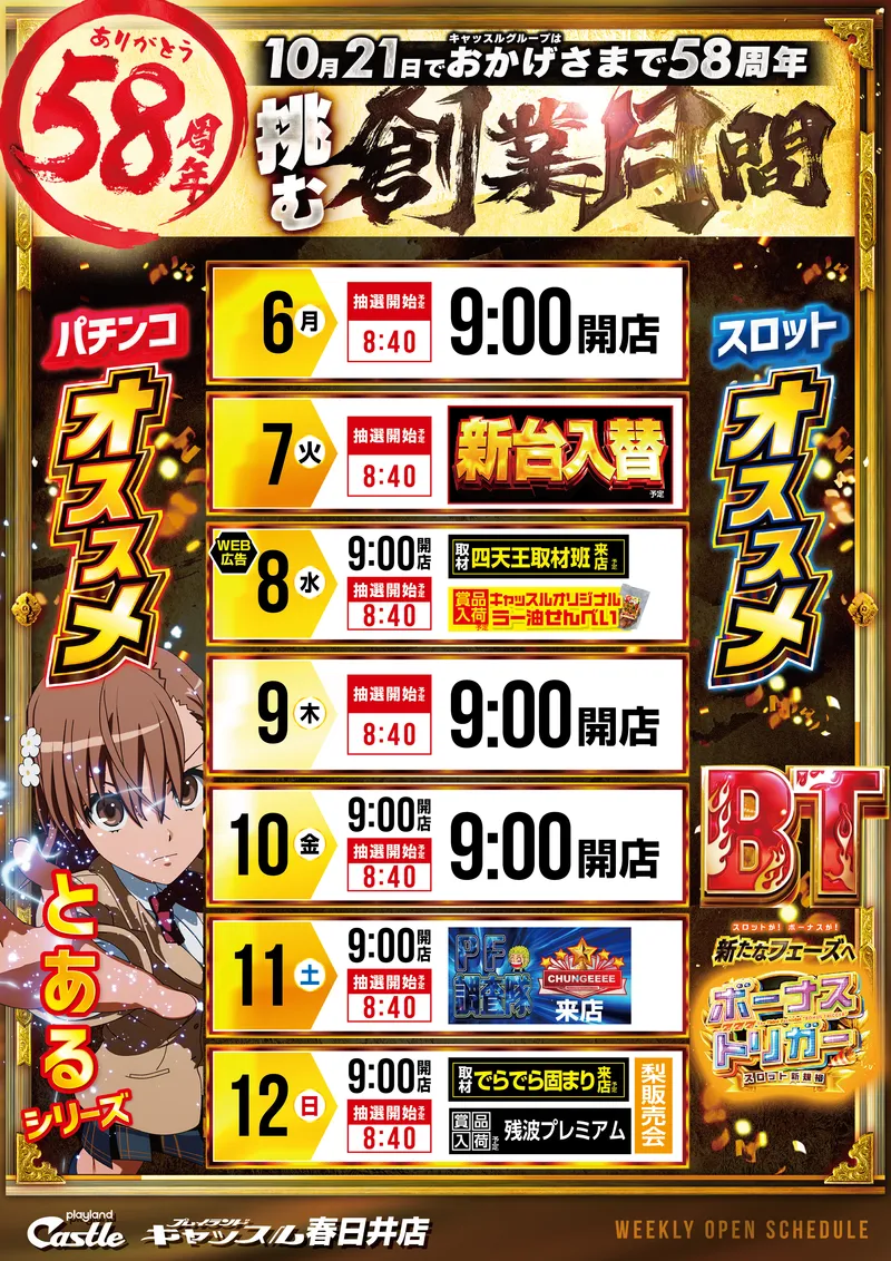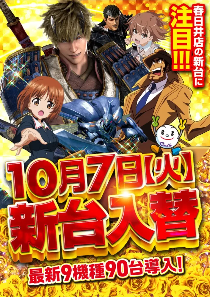 STORE INTRODUCTION 春日井店 NEW MACHINE 新台入替のご案内 10月7日(火)朝9時オープン! 14機種97台 一挙導入 SCHEDULE 賞品入荷スケジュール キャッスルグループ全店10月15日水曜日朝9時オープン MENU 今月のメニュー 01 新台入替 これが最新導入機種だぁぁぁ! 02 オススメ機種 これが面白い!当店オススメはコレ! 03 機種ラインナップ 選べる楽しさ!設置機種情報はこちら! 04 ランキング&台データ 月間ランキングや当日データをチェック 05 入場方法 入場抽選時間や開店時間をチェック! 06 来店情報 有名人・インフルエンサー来店はこちら 07 厳選賞品・総付景品案内 厳選賞品や無料配布をGET! 08 ポイント景品入荷 ポイ活してゲット! 09 屋台 嬉しい!楽しい!催し物いっぱい 10 基本情報・アクセス Let′s Go! 11 設備・サービス 快適遊空間! 各店舗の最新情報やイメージキャラクター吉沢朱音の情報など盛り沢山でおとどけ! MENU メニュー 01 新台入替 02 オススメ機種 03 機種ラインナップ 04 ランキング&台データ 05 入場案内 06 来店情報 07 厳選賞品・総付景品案内 08 ポイント景品入荷 09 屋台 10 基本情報・アクセス 11 設備・サービス