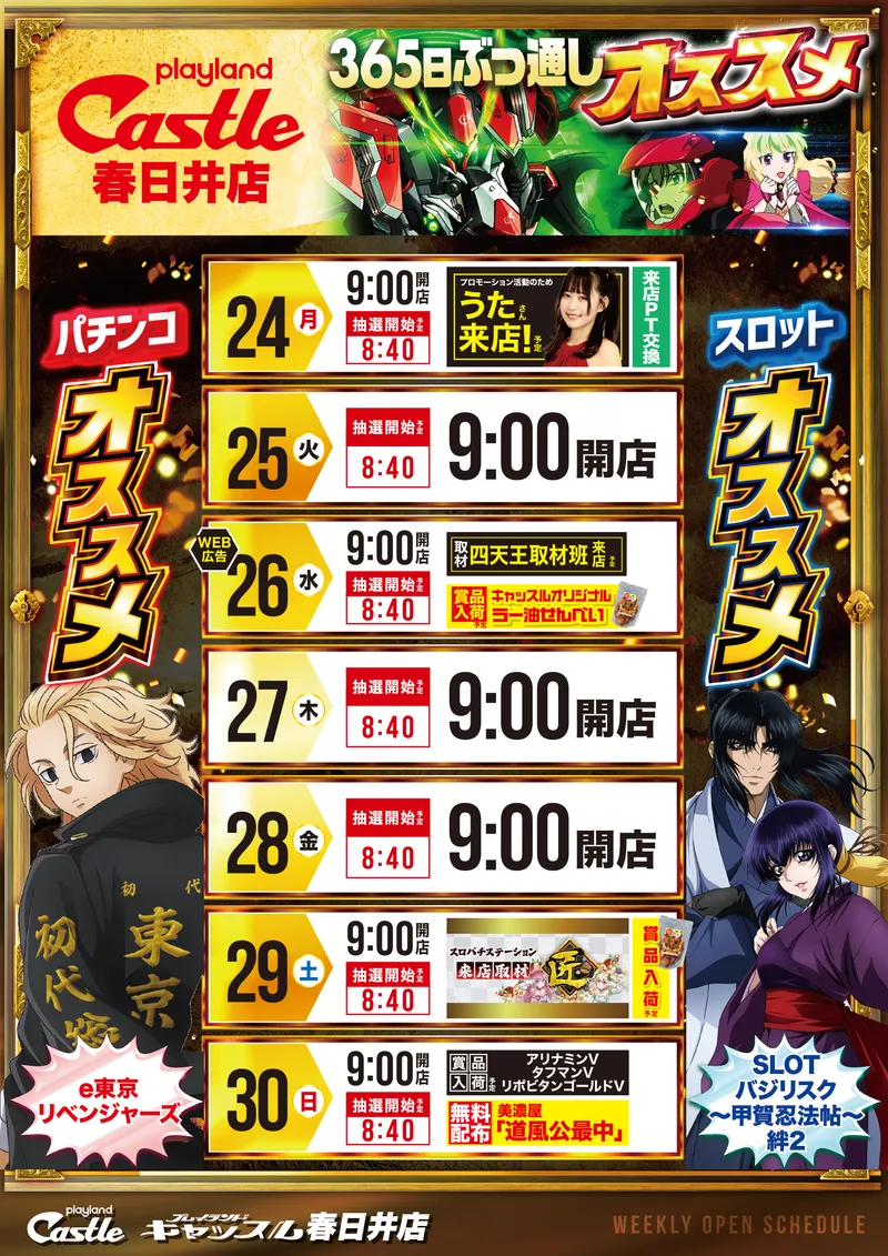 STORE INTRODUCTION 春日井店 NEW MACHINE 新台入替のご案内 11月18日(火)朝9時オープン! 16機種22台 一挙導入 SCHEDULE 賞品入荷スケジュール キャッスルグループ全店11月26日水曜日朝9時オープン MENU 今月のメニュー 01 新台入替 これが最新導入機種だぁぁぁ! 02 オススメ機種 これが面白い!当店オススメはコレ! 03 機種ラインナップ 選べる楽しさ!設置機種情報はこちら! 04 ランキング&台データ 月間ランキングや当日データをチェック 05 入場方法 入場抽選時間や開店時間をチェック! 06 来店情報 有名人・インフルエンサー来店はこちら 07 厳選賞品・総付景品案内 厳選賞品や無料配布をGET! 08 ポイント景品入荷 ポイ活してゲット! 09 屋台 嬉しい!楽しい!催し物いっぱい 10 基本情報・アクセス Let′s Go! 11 設備・サービス 快適遊空間! 各店舗の最新情報やイメージキャラクター吉沢朱音の情報など盛り沢山でおとどけ! MENU メニュー 01 新台入替 02 オススメ機種 03 機種ラインナップ 04 ランキング&台データ 05 入場案内 06 来店情報 07 厳選賞品・総付景品案内 08 ポイント景品入荷 09 屋台 10 基本情報・アクセス 11 設備・サービス