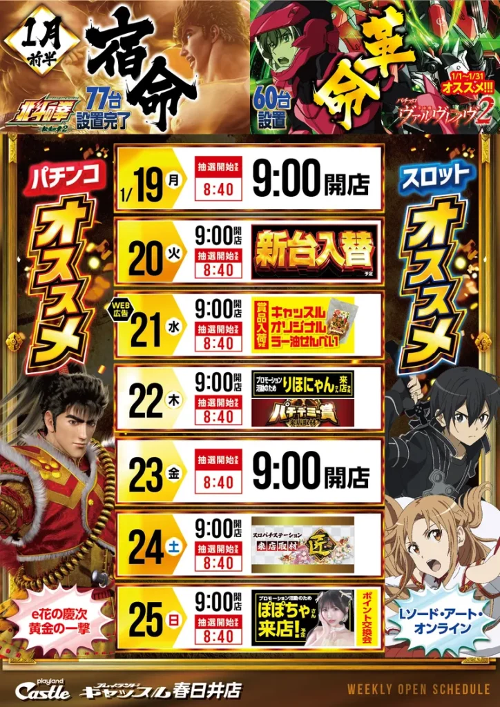 NEW MACHINE 新台入替のご案内 1月27日(火)朝9時オープン! 10機種21台 一挙導入(予定) SCHEDULE スケジュール キャッスルグループ全店1月28日水曜日朝9時オープン MENU 今月のメニュー 01 新台入替 これが最新導入機種だぁぁぁ! 02 オススメ機種 これが面白い!当店オススメはコレ! 03 機種ラインナップ 選べる楽しさ!設置機種情報はこちら! 04 ランキング&台データ 月間ランキングや当日データをチェック 05 入場方法 入場抽選時間や開店時間をチェック! 06 来店情報 有名人・インフルエンサー来店はこちら 07 厳選賞品・総付景品案内 厳選賞品や無料配布をGET! 08 ポイント景品入荷 ポイ活してゲット! 09 屋台 嬉しい!楽しい!催し物いっぱい 10 基本情報・アクセス Let′s Go! 11 設備・サービス 快適遊空間! 各店舗の最新情報やイメージキャラクター吉沢朱音の情報など盛り沢山でおとどけ! MENU メニュー 01 新台入替 02 オススメ機種 03 機種ラインナップ 04 ランキング&台データ 05 入場案内 06 来店情報 07 厳選賞品・総付景品案内 08 ポイント景品入荷 09 屋台 10 基本情報・アクセス 11 設備・サービス