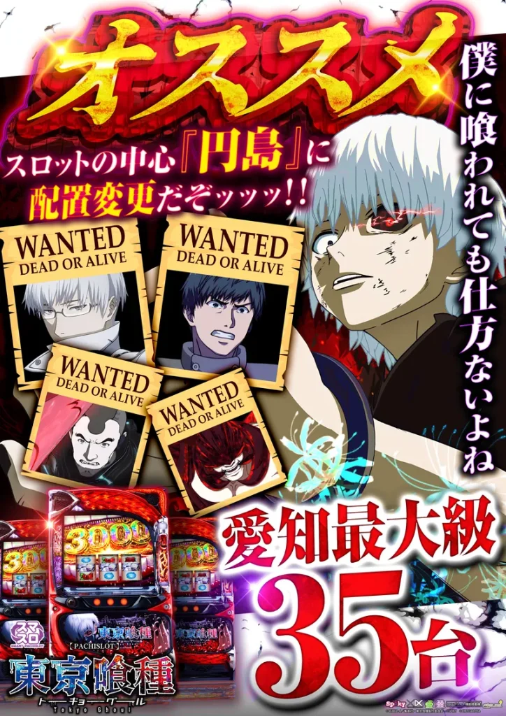 ●大人気作品「東京喰種」がスマスロで登場! ●通常時はゲーム数消化とレア役でCZを抽選 ●ATは純増4.0枚/Gの差枚数管理型 ●喰種対決勝利で特化ゾーン「BITES」に移行 ●完走orVS有馬成功で有馬貴将ジャッジメント獲得 ●有馬貴将ジャッジメント成功で上乗せ300枚〜2000枚! |