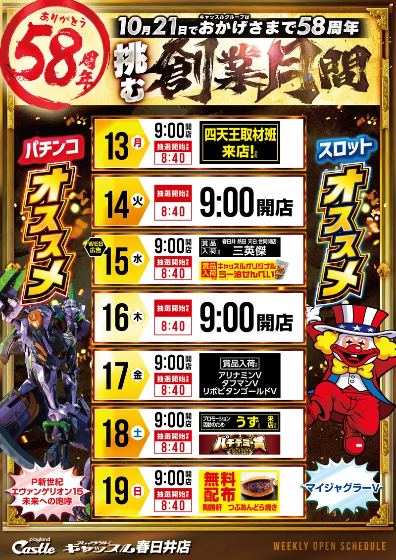 TOP_10/18 18:00 2025 10/18 STORE INTRODUCTION 春日井店 NEW MACHINE 新台入替のご案内 10月21日(火)朝9時オープン! 10機種30台 一挙導入 SCHEDULE 賞品入荷スケジュール キャッスルグループ全店10月22日水曜日朝9時オープン MENU 今月のメニュー 01 新台入替 これが最新導入機種だぁぁぁ! 02 オススメ機種 これが面白い!当店オススメはコレ! 03 機種ラインナップ 選べる楽しさ!設置機種情報はこちら! 04 ランキング&台データ 月間ランキングや当日データをチェック 05 入場方法 入場抽選時間や開店時間をチェック! 06 来店情報 有名人・インフルエンサー来店はこちら 07 厳選賞品・総付景品案内 厳選賞品や無料配布をGET! 08 ポイント景品入荷 ポイ活してゲット! 09 屋台 嬉しい!楽しい!催し物いっぱい 10 基本情報・アクセス Let′s Go! 11 設備・サービス 快適遊空間! 各店舗の最新情報やイメージキャラクター吉沢朱音の情報など盛り沢山でおとどけ! MENU メニュー 01 新台入替 02 オススメ機種 03 機種ラインナップ 04 ランキング&台データ 05 入場案内 06 来店情報 07 厳選賞品・総付景品案内 08 ポイント景品入荷 09 屋台 10 基本情報・アクセス 11 設備・サービス トップ