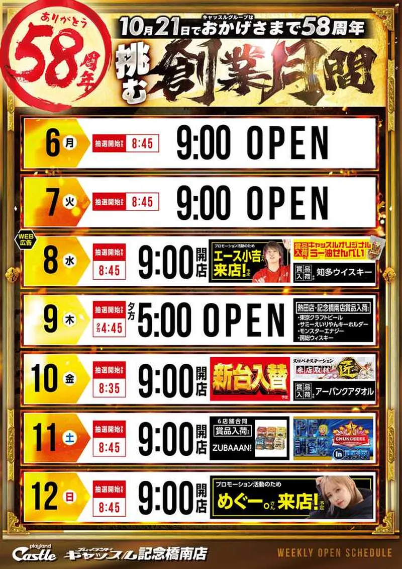 STORE INTRODUCTION 記念橋南店 NEW MACHINE 新台入替のご案内 10月10日(金)朝9時オープン! 27機種73台 一挙導入 SCHEDULE スケジュール キャッスルグループ全店10月15日水曜日朝9時オープン MENU 今月のメニュー 01 新台入替 これが最新導入機種だぁぁぁ! 02 オススメ機種 これが面白い!当店オススメはコレ! 03 機種ラインナップ 選べる楽しさ!設置機種情報はこちら! 04 ランキング&台データ 月間ランキングや当日データをチェック 05 入場方法 入場抽選時間や開店時間をチェック! 06 来店情報 有名人・インフルエンサー来店はこちら 07 厳選賞品・総付景品案内 厳選賞品や無料配布をGET! 08 販売会・ポイント交換 嬉しい!楽しい!催し物いっぱい 09 基本情報・アクセス Let′s Go! 10 設備・サービス 快適遊空間! 各店舗の最新情報やイメージキャラクター吉沢朱音の情報など盛り沢山でおとどけ! MENU メニュー 01 新台入替 02 オススメ機種 03 機種ラインナップ 04 ランキング&台データ 05 入場案内 06 来店情報 07 厳選賞品・総付景品案内 08 販売会・ポイント交換 09 基本情報・アクセス 10 設備・サービス