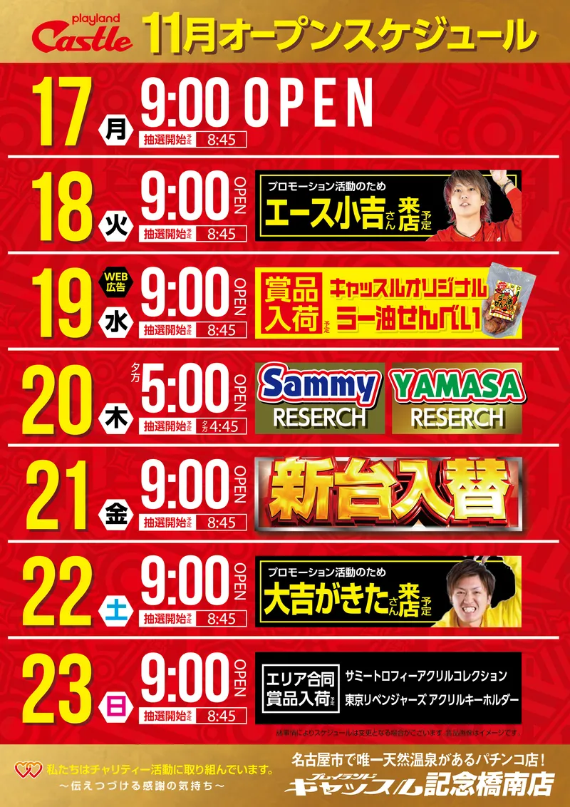 STORE INTRODUCTION 記念橋南店 NEW MACHINE 新台入替のご案内 11月1日(土)朝9時オープン! 42機種110台 一挙導入 SCHEDULE スケジュール キャッスルグループ全店11月19日水曜日朝9時オープン MENU 今月のメニュー 01 新台入替 これが最新導入機種だぁぁぁ! 02 オススメ機種 これが面白い!当店オススメはコレ! 03 機種ラインナップ 選べる楽しさ!設置機種情報はこちら! 04 ランキング&台データ 月間ランキングや当日データをチェック 05 入場方法 入場抽選時間や開店時間をチェック! 06 来店情報 有名人・インフルエンサー来店はこちら 07 厳選賞品・総付景品案内 厳選賞品や無料配布をGET! 08 販売会・ポイント交換 嬉しい!楽しい!催し物いっぱい 09 基本情報・アクセス Let′s Go! 10 設備・サービス 快適遊空間! 各店舗の最新情報やイメージキャラクター吉沢朱音の情報など盛り沢山でおとどけ! MENU メニュー 01 新台入替 02 オススメ機種 03 機種ラインナップ 04 ランキング&台データ 05 入場案内 06 来店情報 07 厳選賞品・総付景品案内 08 販売会・ポイント交換 09 基本情報・アクセス 10 設備・サービス