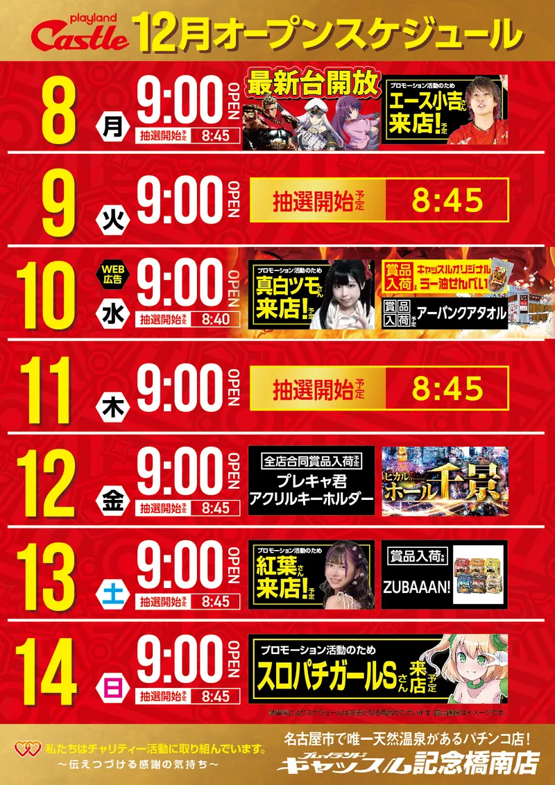 STORE INTRODUCTION 記念橋南店 NEW MACHINE 新台入替のご案内 12月5日(金)朝9時オープン! 44機種99台 一挙導入 SCHEDULE スケジュール キャッスルグループ全店12月10日水曜日朝9時オープン MENU 今月のメニュー 01 新台入替 これが最新導入機種だぁぁぁ! 02 オススメ機種 これが面白い!当店オススメはコレ! 03 機種ラインナップ 選べる楽しさ!設置機種情報はこちら! 04 ランキング&台データ 月間ランキングや当日データをチェック 05 入場方法 入場抽選時間や開店時間をチェック! 06 来店情報 有名人・インフルエンサー来店はこちら 07 厳選賞品・総付景品案内 厳選賞品や無料配布をGET! 08 販売会・ポイント交換 嬉しい!楽しい!催し物いっぱい 09 基本情報・アクセス Let′s Go! 10 設備・サービス 快適遊空間! 各店舗の最新情報やイメージキャラクター吉沢朱音の情報など盛り沢山でおとどけ! MENU メニュー 01 新台入替 02 オススメ機種 03 機種ラインナップ 04 ランキング&台データ 05 入場案内 06 来店情報 07 厳選賞品・総付景品案内 08 販売会・ポイント交換 09 基本情報・アクセス 10 設備・サービス