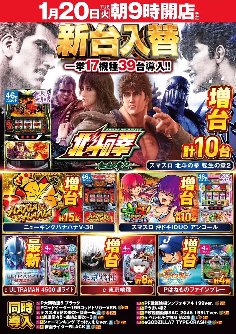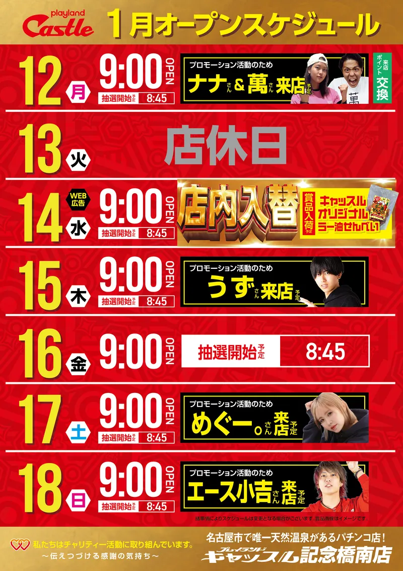 STORE INTRODUCTION 記念橋南店 NEW MACHINE 新台入替のご案内 1月20日(火)朝9時オープン! 17機種39台 一挙導入(予定) SCHEDULE スケジュール キャッスルグループ全店1月21日水曜日朝9時オープン MENU 今月のメニュー 01 新台入替 これが最新導入機種だぁぁぁ! 02 オススメ機種 これが面白い!当店オススメはコレ! 03 機種ラインナップ 選べる楽しさ!設置機種情報はこちら! 04 ランキング&台データ 月間ランキングや当日データをチェック 05 入場方法 入場抽選時間や開店時間をチェック! 06 来店情報 有名人・インフルエンサー来店はこちら 07 厳選賞品・総付景品案内 厳選賞品や無料配布をGET! 08 販売会・ポイント交換 嬉しい!楽しい!催し物いっぱい 09 基本情報・アクセス Let′s Go! 10 設備・サービス 快適遊空間! 各店舗の最新情報やイメージキャラクター吉沢朱音の情報など盛り沢山でおとどけ! MENU メニュー 01 新台入替 02 オススメ機種 03 機種ラインナップ 04 ランキング&台データ 05 入場案内 06 来店情報 07 厳選賞品・総付景品案内 08 販売会・ポイント交換 09 基本情報・アクセス 10 設備・サービス