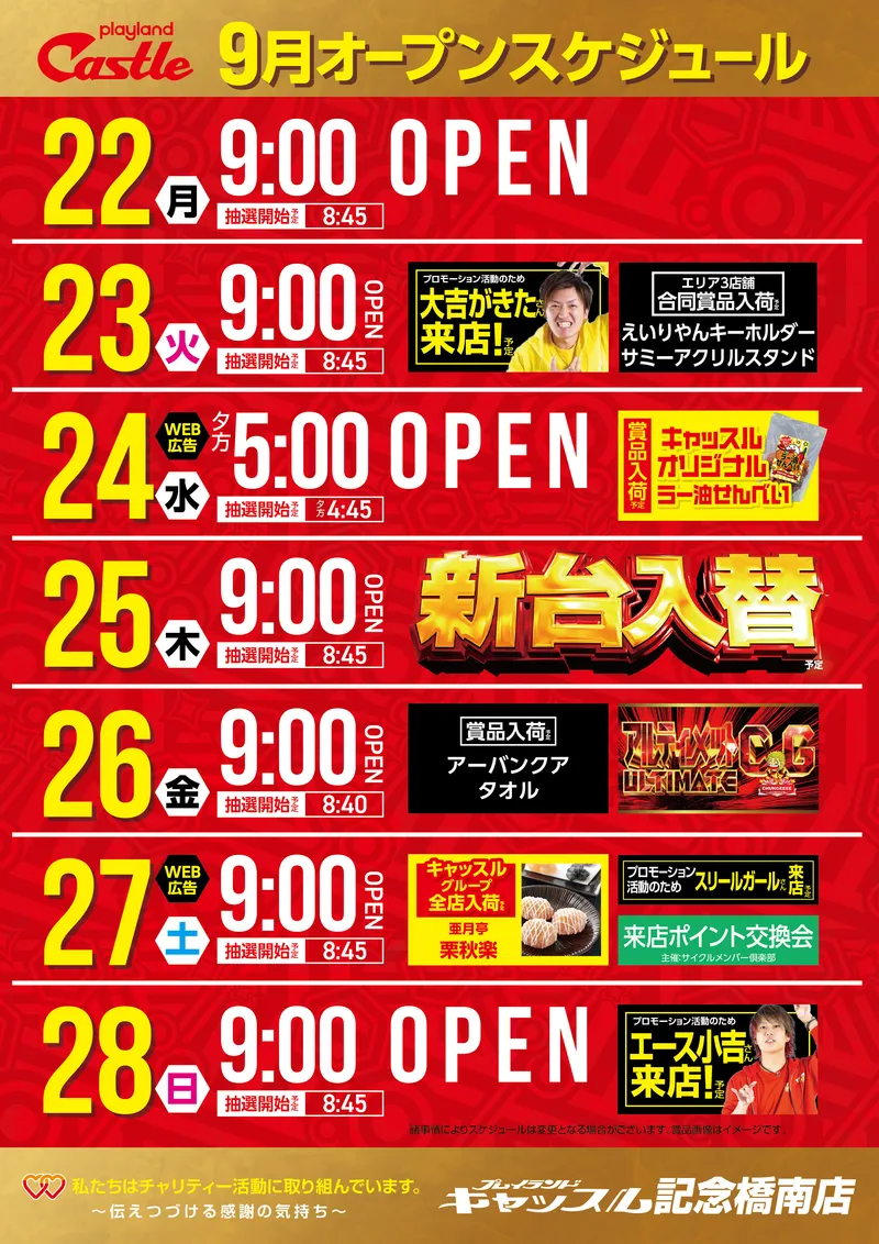 TOP_9/24 18:00 2025 9/24 STORE INTRODUCTION 記念橋南店 NEW MACHINE 新台入替のご案内 9月25日(木)朝9時オープン! 21機種54台 一挙導入 SCHEDULE スケジュール キャッスルグループ全店9月27日土曜日朝9時オープン MENU 今月のメニュー 01 新台入替 これが最新導入機種だぁぁぁ! 02 オススメ機種 これが面白い!当店オススメはコレ! 03 機種ラインナップ 選べる楽しさ!設置機種情報はこちら! 04 ランキング&台データ 月間ランキングや当日データをチェック 05 入場方法 入場抽選時間や開店時間をチェック! 06 来店情報 有名人・インフルエンサー来店はこちら 07 厳選賞品・総付景品案内 厳選賞品や無料配布をGET! 08 販売会・ポイント交換 嬉しい!楽しい!催し物いっぱい 09 基本情報・アクセス Let′s Go! 10 設備・サービス 快適遊空間! 各店舗の最新情報やイメージキャラクター吉沢朱音の情報など盛り沢山でおとどけ! MENU メニュー 01 新台入替 02 オススメ機種 03 機種ラインナップ 04 ランキング&台データ 05 入場案内 06 来店情報 07 厳選賞品・総付景品案内 08 販売会・ポイント交換 09 基本情報・アクセス 10 設備・サービス トップ