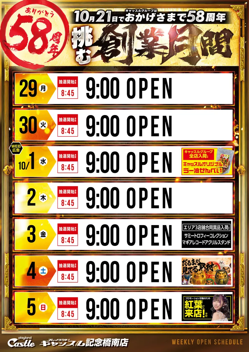 TOP_10/1 18:00 2025 10/01 STORE INTRODUCTION 記念橋南店 NEW MACHINE 新台入替のご案内 9月25日(木)朝9時オープン! 21機種54台 一挙導入 SCHEDULE スケジュール キャッスルグループ全店10月8日水曜日朝9時オープン MENU 今月のメニュー 01 新台入替 これが最新導入機種だぁぁぁ! 02 オススメ機種 これが面白い!当店オススメはコレ! 03 機種ラインナップ 選べる楽しさ!設置機種情報はこちら! 04 ランキング&台データ 月間ランキングや当日データをチェック 05 入場方法 入場抽選時間や開店時間をチェック! 06 来店情報 有名人・インフルエンサー来店はこちら 07 厳選賞品・総付景品案内 厳選賞品や無料配布をGET! 08 販売会・ポイント交換 嬉しい!楽しい!催し物いっぱい 09 基本情報・アクセス Let′s Go! 10 設備・サービス 快適遊空間! 各店舗の最新情報やイメージキャラクター吉沢朱音の情報など盛り沢山でおとどけ! MENU メニュー 01 新台入替 02 オススメ機種 03 機種ラインナップ 04 ランキング&台データ 05 入場案内 06 来店情報 07 厳選賞品・総付景品案内 08 販売会・ポイント交換 09 基本情報・アクセス 10 設備・サービス トップ