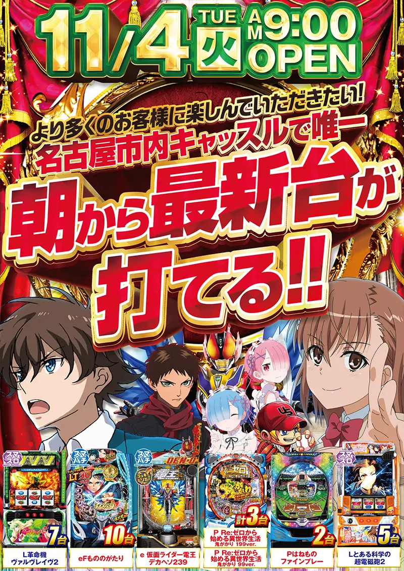 TOP_10/23 18:00 2025 10/23 STORE INTRODUCTION 記念橋南店 NEW MACHINE 新台入替のご案内 10月10日(金)朝9時オープン! 27機種73台 一挙導入 SCHEDULE スケジュール キャッスルグループ全店10月25日土曜日朝9時オープン MENU 今月のメニュー 01 新台入替 これが最新導入機種だぁぁぁ! 02 オススメ機種 これが面白い!当店オススメはコレ! 03 機種ラインナップ 選べる楽しさ!設置機種情報はこちら! 04 ランキング&台データ 月間ランキングや当日データをチェック 05 入場方法 入場抽選時間や開店時間をチェック! 06 来店情報 有名人・インフルエンサー来店はこちら 07 厳選賞品・総付景品案内 厳選賞品や無料配布をGET! 08 販売会・ポイント交換 嬉しい!楽しい!催し物いっぱい 09 基本情報・アクセス Let′s Go! 10 設備・サービス 快適遊空間! 各店舗の最新情報やイメージキャラクター吉沢朱音の情報など盛り沢山でおとどけ! MENU メニュー 01 新台入替 02 オススメ機種 03 機種ラインナップ 04 ランキング&台データ 05 入場案内 06 来店情報 07 厳選賞品・総付景品案内 08 販売会・ポイント交換 09 基本情報・アクセス 10 設備・サービス トップ