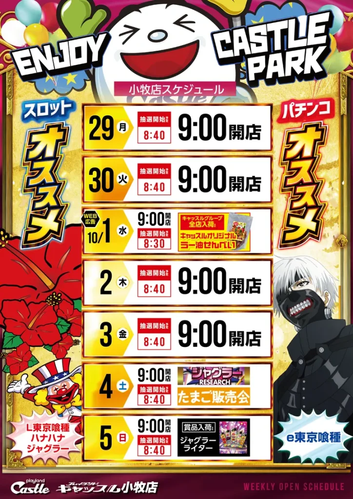 STORE INTRODUCTION 小牧店 NEW MACHINE 新台入替のご案内 9月22日(月)朝9時オープン! 7機種18台 一挙導入 SCHEDULE スケジュール キャッスルグループ全店10月8日水曜日朝9時オープン MENU 今月のメニュー 01 新台入替 これが最新導入機種だぁぁぁ! 02 オススメ機種 これが面白い!当店オススメはコレ! 03 機種ラインナップ 選べる楽しさ!設置機種情報はこちら! 04 ランキング&台データ 月間ランキングや当日データをチェック 05 入場方法 入場抽選時間や開店時間をチェック! 06 来店情報 有名人・インフルエンサー来店はこちら 07 厳選賞品・総付景品案内 厳選賞品や無料配布をGET! 08 ポイント景品入荷 ポイ活してゲット! 09 販売会・屋台 嬉しい!楽しい!催し物いっぱい 10 基本情報・アクセス Let′s Go! 11 設備・サービス 快適遊空間! 各店舗の最新情報やイメージキャラクター吉沢朱音の情報など盛り沢山でおとどけ! MENU メニュー 01 新台入替 02 オススメ機種 03 機種ラインナップ 04 ランキング&台データ 05 入場案内 06 来店情報 07 厳選賞品・総付景品案内 08 ポイント景品入荷 09 販売会・屋台 10 基本情報・アクセス 11 設備・サービス
