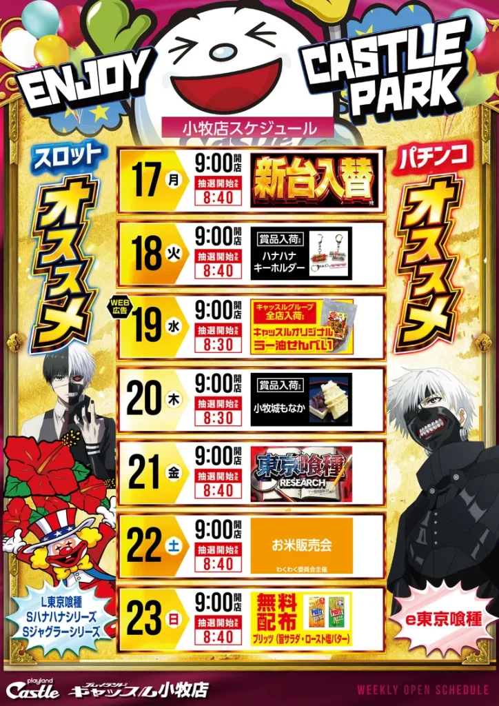 STORE INTRODUCTION 小牧店 NEW MACHINE 新台入替のご案内 11月17日(月)朝9時オープン! 15機種28台 一挙導入 SCHEDULE スケジュール キャッスルグループ全店11月26日水曜日朝9時オープン MENU 今月のメニュー 01 新台入替 これが最新導入機種だぁぁぁ! 02 オススメ機種 これが面白い!当店オススメはコレ! 03 機種ラインナップ 選べる楽しさ!設置機種情報はこちら! 04 ランキング&台データ 月間ランキングや当日データをチェック 05 入場方法 入場抽選時間や開店時間をチェック! 06 来店情報 有名人・インフルエンサー来店はこちら 07 厳選賞品・総付景品案内 厳選賞品や無料配布をGET! 08 ポイント景品入荷 ポイ活してゲット! 09 販売会・屋台 嬉しい!楽しい!催し物いっぱい 10 基本情報・アクセス Let′s Go! 11 設備・サービス 快適遊空間! 各店舗の最新情報やイメージキャラクター吉沢朱音の情報など盛り沢山でおとどけ! MENU メニュー 01 新台入替 02 オススメ機種 03 機種ラインナップ 04 ランキング&台データ 05 入場案内 06 来店情報 07 厳選賞品・総付景品案内 08 ポイント景品入荷 09 販売会・屋台 10 基本情報・アクセス 11 設備・サービス