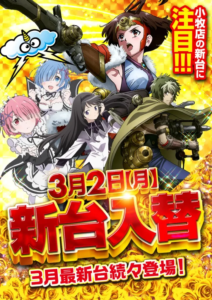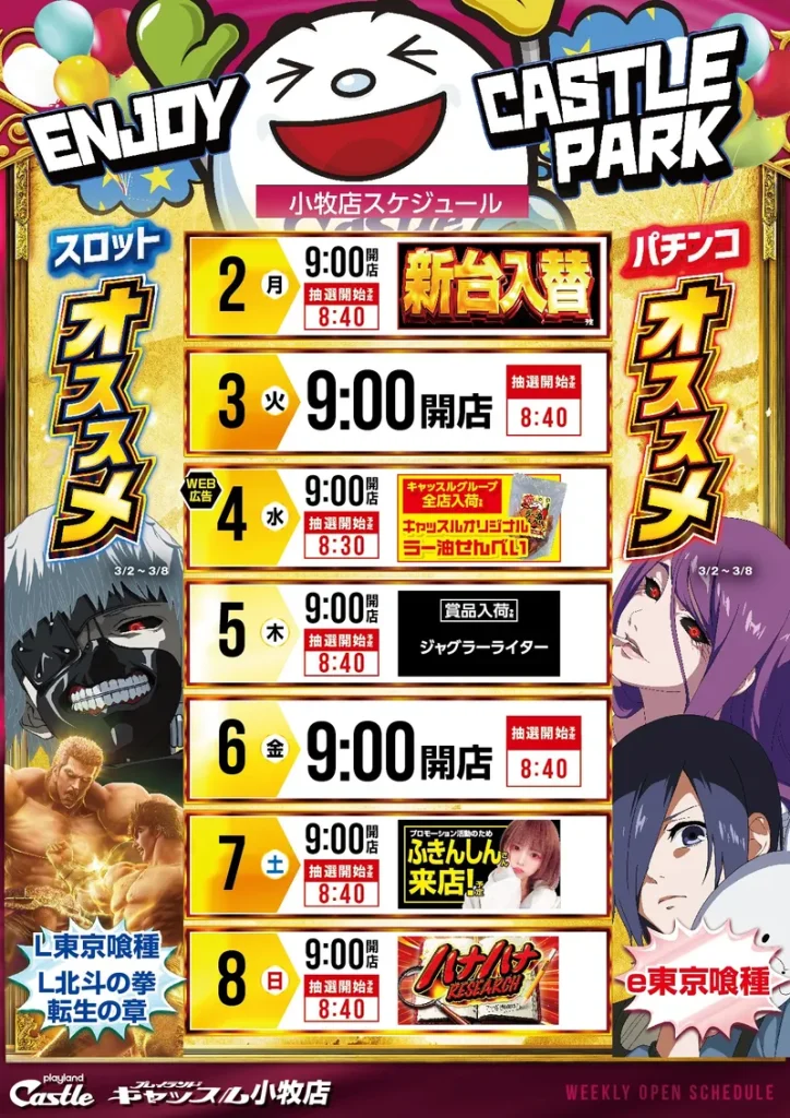 NEW MACHINE 新台入替のご案内 3月2日(月)朝9時オープン! 6機種37台 一挙導入予定 SCHEDULE スケジュール キャッスルグループ全店3月4日水曜日朝9時オープン MENU 今月のメニュー 01 新台入替 これが最新導入機種だぁぁぁ! 02 オススメ機種 これが面白い!当店オススメはコレ! 03 機種ラインナップ 選べる楽しさ!設置機種情報はこちら! 04 ランキング&台データ 月間ランキングや当日データをチェック 05 入場方法 入場抽選時間や開店時間をチェック! 06 来店情報 有名人・インフルエンサー来店はこちら 07 厳選賞品・総付景品案内 厳選賞品や無料配布をGET! 08 ポイント景品入荷 ポイ活してゲット! 09 販売会・屋台 嬉しい!楽しい!催し物いっぱい 10 基本情報・アクセス Let′s Go! 11 設備・サービス 快適遊空間! 各店舗の最新情報やイメージキャラクター吉沢朱音の情報など盛り沢山でおとどけ! MENU メニュー 01 新台入替 02 オススメ機種 03 機種ラインナップ 04 ランキング&台データ 05 入場案内 06 来店情報 07 厳選賞品・総付景品案内 08 ポイント景品入荷 09 販売会・屋台 10 基本情報・アクセス 11 設備・サービス