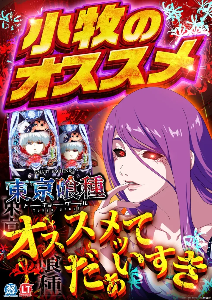●大人気作品「東京喰種」がスマスロで登場! ●通常時はゲーム数消化とレア役でCZを抽選 ●ATは純増4.0枚/Gの差枚数管理型 ●喰種対決勝利で特化ゾーン「BITES」に移行 ●完走orVS有馬成功で有馬貴将ジャッジメント獲得 ●有馬貴将ジャッジメント成功で上乗せ300枚〜2000枚! |