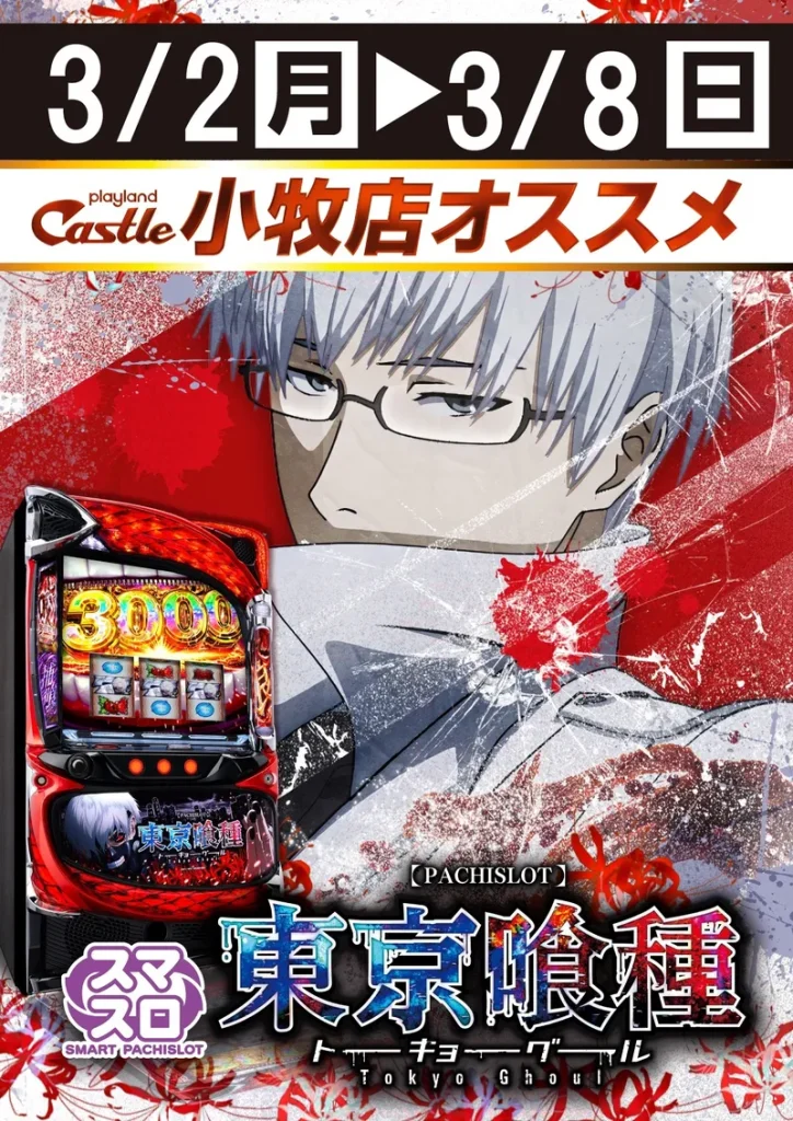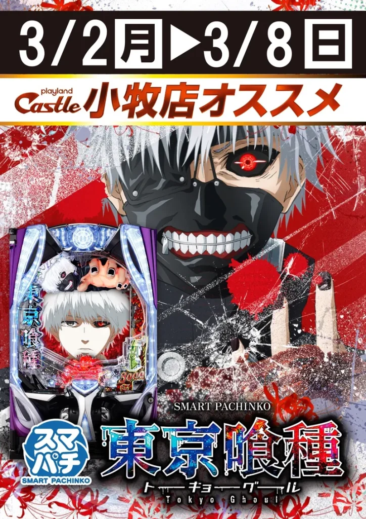 ●大人気作品「東京喰種」がスマスロで登場! ●通常時はゲーム数消化とレア役でCZを抽選 ●ATは純増4.0枚/Gの差枚数管理型 ●喰種対決勝利で特化ゾーン「BITES」に移行 ●完走orVS有馬成功で有馬貴将ジャッジメント獲得 ●有馬貴将ジャッジメント成功で上乗せ300枚〜2000枚! |