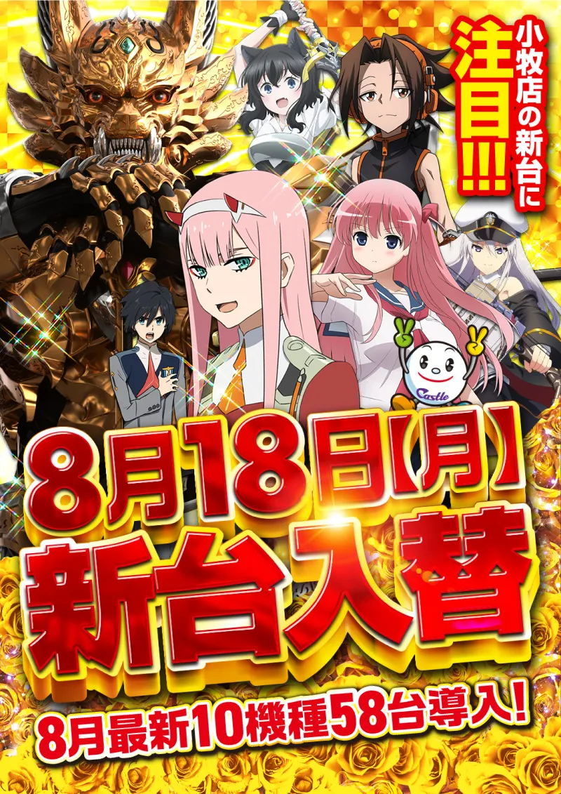 トップ_8/31 18:00 2025 8/31 NEW MACHINE 新台入替のご案内 8月18日(月)朝9時オープン! 23機種51台 一挙導入 SCHEDULE スケジュール キャッスルグループ全店9月3日水曜日朝9時オープン MENU 今月のメニュー 01 新台入替 これが最新導入機種だぁぁぁ! 02 オススメ機種 これが面白い!当店オススメはコレ! 03 機種ラインナップ 選べる楽しさ!設置機種情報はこちら! 04 ランキング&台データ 月間ランキングや当日データをチェック 05 入場方法 入場抽選時間や開店時間をチェック! 06 来店情報 有名人・インフルエンサー来店はこちら 07 厳選賞品・総付景品案内 厳選賞品や無料配布をGET! 08 ポイント景品入荷 ポイ活してゲット! 09 販売会・屋台 嬉しい!楽しい!催し物いっぱい 10 基本情報・アクセス Let′s Go! 11 設備・サービス 快適遊空間! 各店舗の最新情報やイメージキャラクター吉沢朱音の情報など盛り沢山でおとどけ! MENU メニュー 01 新台入替 02 オススメ機種 03 機種ラインナップ 04 ランキング&台データ 05 入場案内 06 来店情報 07 厳選賞品・総付景品案内 08 ポイント景品入荷 09 販売会・屋台 10 基本情報・アクセス 11 設備・サービス トップ