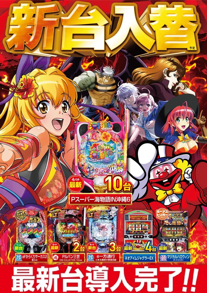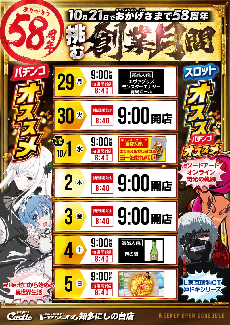STORE INTRODUCTION 知多にしの台店 NEW MACHINE 新台入替のご案内 9月22日(月)昼12時オープン! 6機種21台 一挙導入 SCHEDULE スケジュール キャッスルグループ全店10月8日水曜日朝9時オープン MENU 今月のメニュー 01 新台入替 これが最新導入機種だぁぁぁ! 02 オススメ機種 これが面白い!当店オススメはコレ! 03 機種ラインナップ 選べる楽しさ!設置機種情報はこちら! 04 ランキング&台データ 月間ランキングや当日データをチェック 05 入場方法 入場抽選時間や開店時間をチェック! 06 来店情報 有名人・インフルエンサー来店はこちら 07 厳選賞品・総付景品案内 厳選賞品や無料配布をGET! 08 屋台 嬉しい!楽しい!催し物いっぱい 09 基本情報・アクセス Let′s Go! 10 設備・サービス 快適遊空間! 各店舗の最新情報やイメージキャラクター吉沢朱音の情報など盛り沢山でおとどけ! MENU メニュー 01 新台入替 02 オススメ機種 03 機種ラインナップ 04 ランキング&台データ 05 入場案内 06 来店情報 07 厳選賞品・総付景品案内 08 屋台 09 基本情報・アクセス 10 設備・サービス