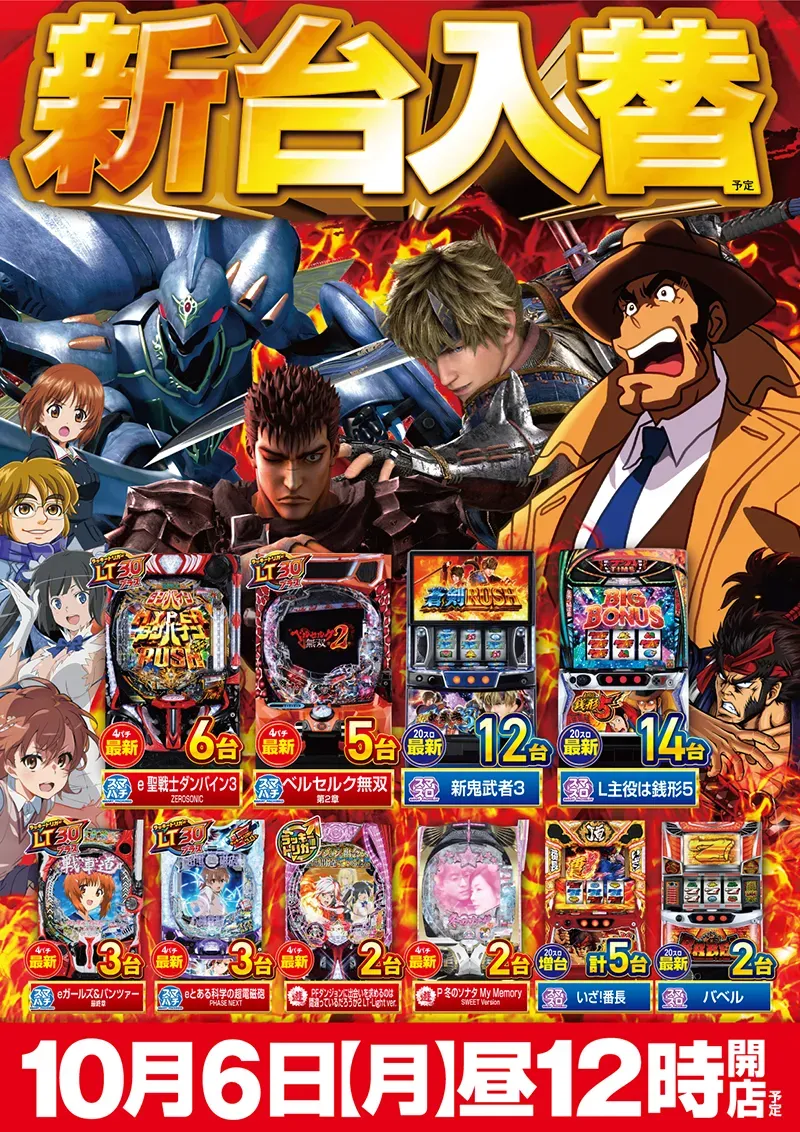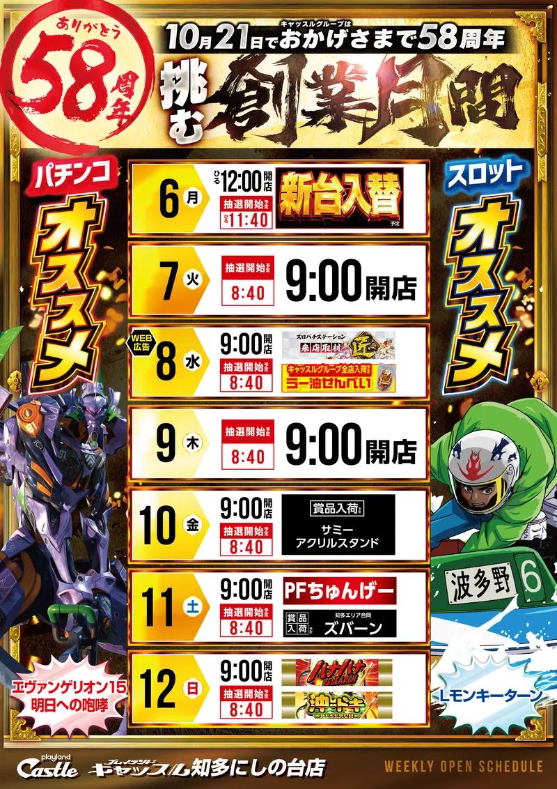STORE INTRODUCTION 知多にしの台店 NEW MACHINE 新台入替のご案内 10月6日(月)昼12時オープン! 10機種50台 一挙導入 SCHEDULE スケジュール キャッスルグループ全店10月15日水曜日朝9時オープン MENU 今月のメニュー 01 新台入替 これが最新導入機種だぁぁぁ! 02 オススメ機種 これが面白い!当店オススメはコレ! 03 機種ラインナップ 選べる楽しさ!設置機種情報はこちら! 04 ランキング&台データ 月間ランキングや当日データをチェック 05 入場方法 入場抽選時間や開店時間をチェック! 06 来店情報 有名人・インフルエンサー来店はこちら 07 厳選賞品・総付景品案内 厳選賞品や無料配布をGET! 08 屋台 嬉しい!楽しい!催し物いっぱい 09 基本情報・アクセス Let′s Go! 10 設備・サービス 快適遊空間! 各店舗の最新情報やイメージキャラクター吉沢朱音の情報など盛り沢山でおとどけ! MENU メニュー 01 新台入替 02 オススメ機種 03 機種ラインナップ 04 ランキング&台データ 05 入場案内 06 来店情報 07 厳選賞品・総付景品案内 08 屋台 09 基本情報・アクセス 10 設備・サービス