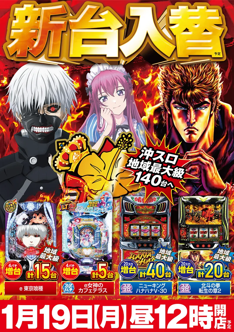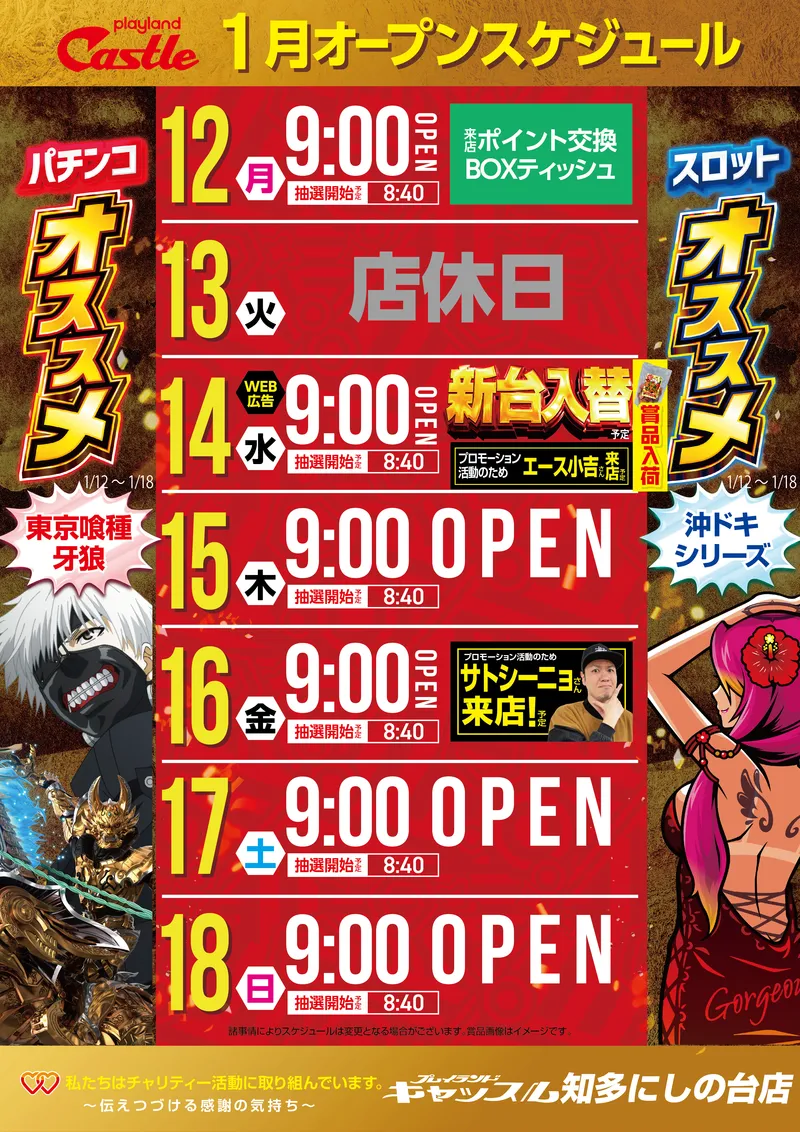 STORE INTRODUCTION 知多にしの台店 NEW MACHINE 新台入替のご案内 1月19日(月)昼12時オープン! 4機種36台 一挙導入 SCHEDULE スケジュール キャッスルグループ全店1月21日水曜日朝9時オープン MENU 今月のメニュー 01 新台入替 これが最新導入機種だぁぁぁ! 02 オススメ機種 これが面白い!当店オススメはコレ! 03 機種ラインナップ 選べる楽しさ!設置機種情報はこちら! 04 ランキング&台データ 月間ランキングや当日データをチェック 05 入場方法 入場抽選時間や開店時間をチェック! 06 来店情報 有名人・インフルエンサー来店はこちら 07 厳選賞品・総付景品案内 厳選賞品や無料配布をGET! 08 屋台 嬉しい!楽しい!催し物いっぱい 09 基本情報・アクセス Let′s Go! 10 設備・サービス 快適遊空間! 各店舗の最新情報やイメージキャラクター吉沢朱音の情報など盛り沢山でおとどけ! MENU メニュー 01 新台入替 02 オススメ機種 03 機種ラインナップ 04 ランキング&台データ 05 入場案内 06 来店情報 07 厳選賞品・総付景品案内 08 屋台 09 基本情報・アクセス 10 設備・サービス
