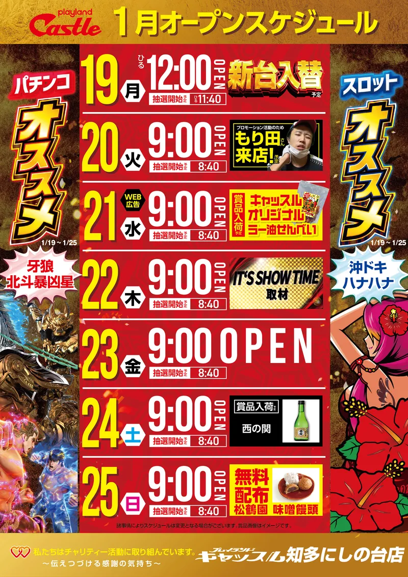 STORE INTRODUCTION 知多にしの台店 NEW MACHINE 新台入替のご案内 1月19日(月)朝9時オープン! 4機種36台 一挙導入 SCHEDULE スケジュール キャッスルグループ全店1月28日水曜日朝9時オープン MENU 今月のメニュー 01 新台入替 これが最新導入機種だぁぁぁ! 02 オススメ機種 これが面白い!当店オススメはコレ! 03 機種ラインナップ 選べる楽しさ!設置機種情報はこちら! 04 ランキング&台データ 月間ランキングや当日データをチェック 05 入場方法 入場抽選時間や開店時間をチェック! 06 来店情報 有名人・インフルエンサー来店はこちら 07 厳選賞品・総付景品案内 厳選賞品や無料配布をGET! 08 屋台 嬉しい!楽しい!催し物いっぱい 09 基本情報・アクセス Let′s Go! 10 設備・サービス 快適遊空間! 各店舗の最新情報やイメージキャラクター吉沢朱音の情報など盛り沢山でおとどけ! MENU メニュー 01 新台入替 02 オススメ機種 03 機種ラインナップ 04 ランキング&台データ 05 入場案内 06 来店情報 07 厳選賞品・総付景品案内 08 屋台 09 基本情報・アクセス 10 設備・サービス