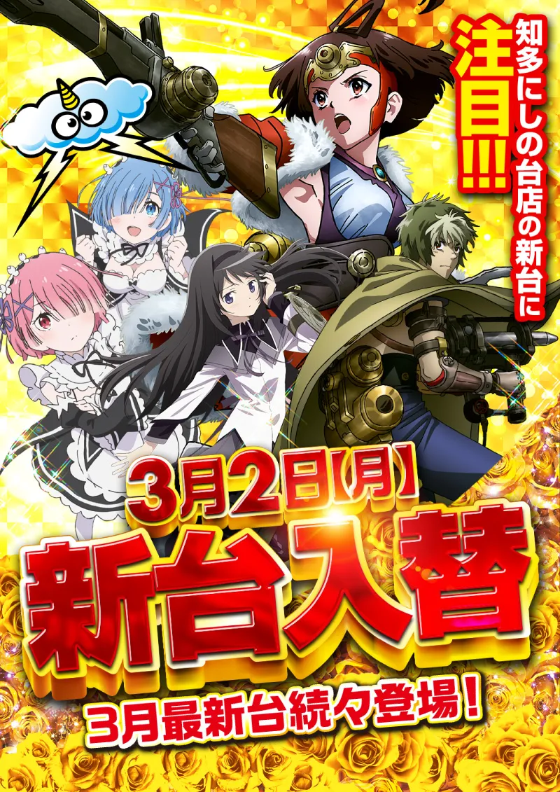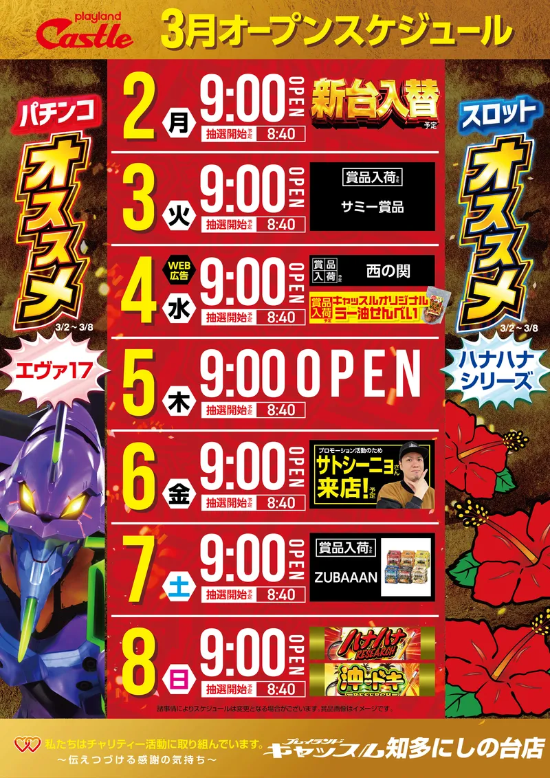STORE INTRODUCTION 知多にしの台店 NEW MACHINE 新台入替のご案内 3月2日(月)昼12時オープン! 5機種30台 一挙導入 SCHEDULE スケジュール キャッスルグループ全店3月11日水曜日朝9時オープン MENU 今月のメニュー 01 新台入替 これが最新導入機種だぁぁぁ! 02 オススメ機種 これが面白い!当店オススメはコレ! 03 機種ラインナップ 選べる楽しさ!設置機種情報はこちら! 04 ランキング&台データ 月間ランキングや当日データをチェック 05 入場方法 入場抽選時間や開店時間をチェック! 06 来店情報 有名人・インフルエンサー来店はこちら 07 厳選賞品・総付景品案内 厳選賞品や無料配布をGET! 08 屋台 嬉しい!楽しい!催し物いっぱい 09 基本情報・アクセス Let′s Go! 10 設備・サービス 快適遊空間! 各店舗の最新情報やイメージキャラクター吉沢朱音の情報など盛り沢山でおとどけ! MENU メニュー 01 新台入替 02 オススメ機種 03 機種ラインナップ 04 ランキング&台データ 05 入場案内 06 来店情報 07 厳選賞品・総付景品案内 08 屋台 09 基本情報・アクセス 10 設備・サービス