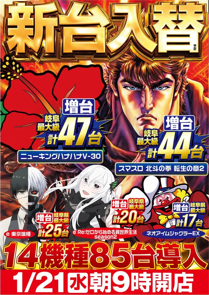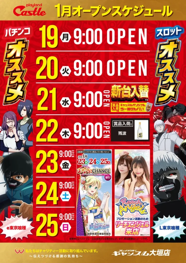 STORE INTRODUCTION 大垣店 NEW MACHINE 新台入替のご案内 1月21日(水)朝9時オープン! 14機種85台導入! SCHEDULE スケジュール キャッスルグループ全店1月21日水曜日朝9時オープン MENU 今月のメニュー 01 新台入替 これが最新導入機種だぁぁぁ! 02 オススメ機種 これが面白い!当店オススメはコレ! 03 機種ラインナップ 選べる楽しさ!設置機種情報はこちら! 04 台データ 当日データをチェック 05 入場方法 入場抽選時間や開店時間をチェック! 06 来店情報 有名人・インフルエンサー来店はこちら 07 厳選賞品・総付景品案内 厳選賞品や無料配布をGET! 08 基本情報・アクセス Let′s Go! 09 設備・サービス 快適遊空間! 各店舗の最新情報やイメージキャラクター吉沢朱音の情報など盛り沢山でおとどけ! MENU メニュー 01 新台入替 02 オススメ機種 03 機種ラインナップ 04 台データ 05 入場案内 06 来店情報 07 厳選賞品・総付景品案内 08 基本情報・アクセス 09 設備・サービス