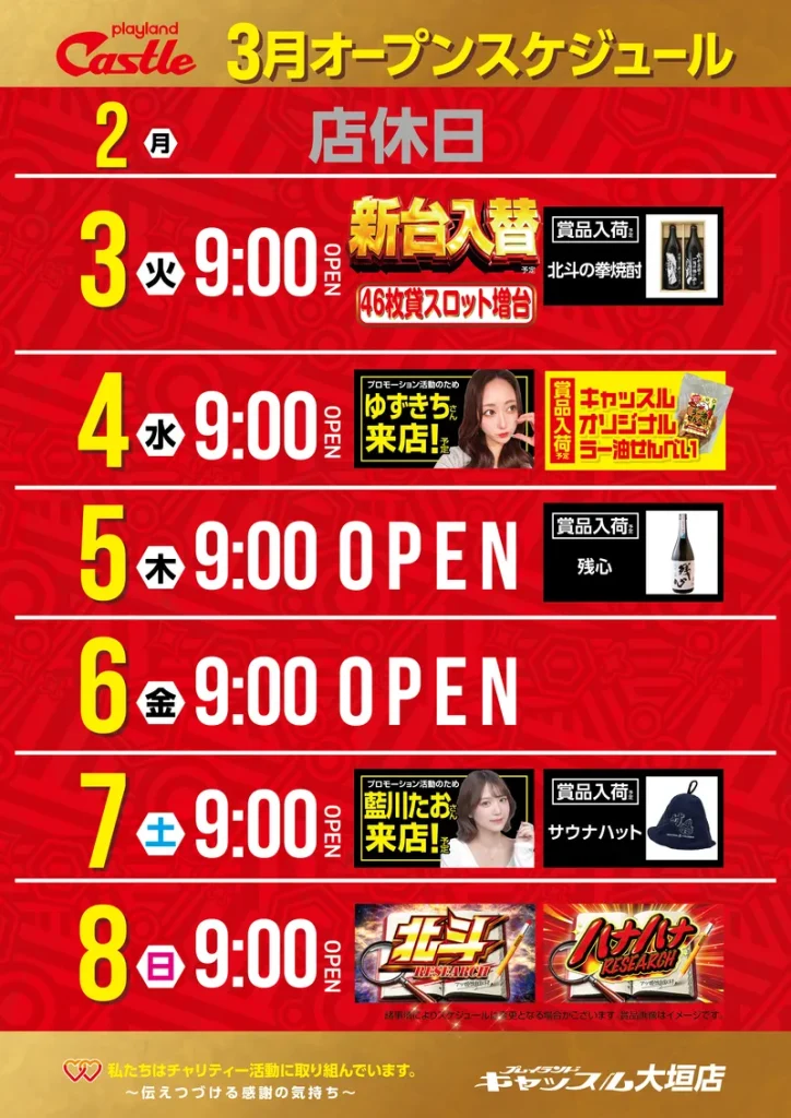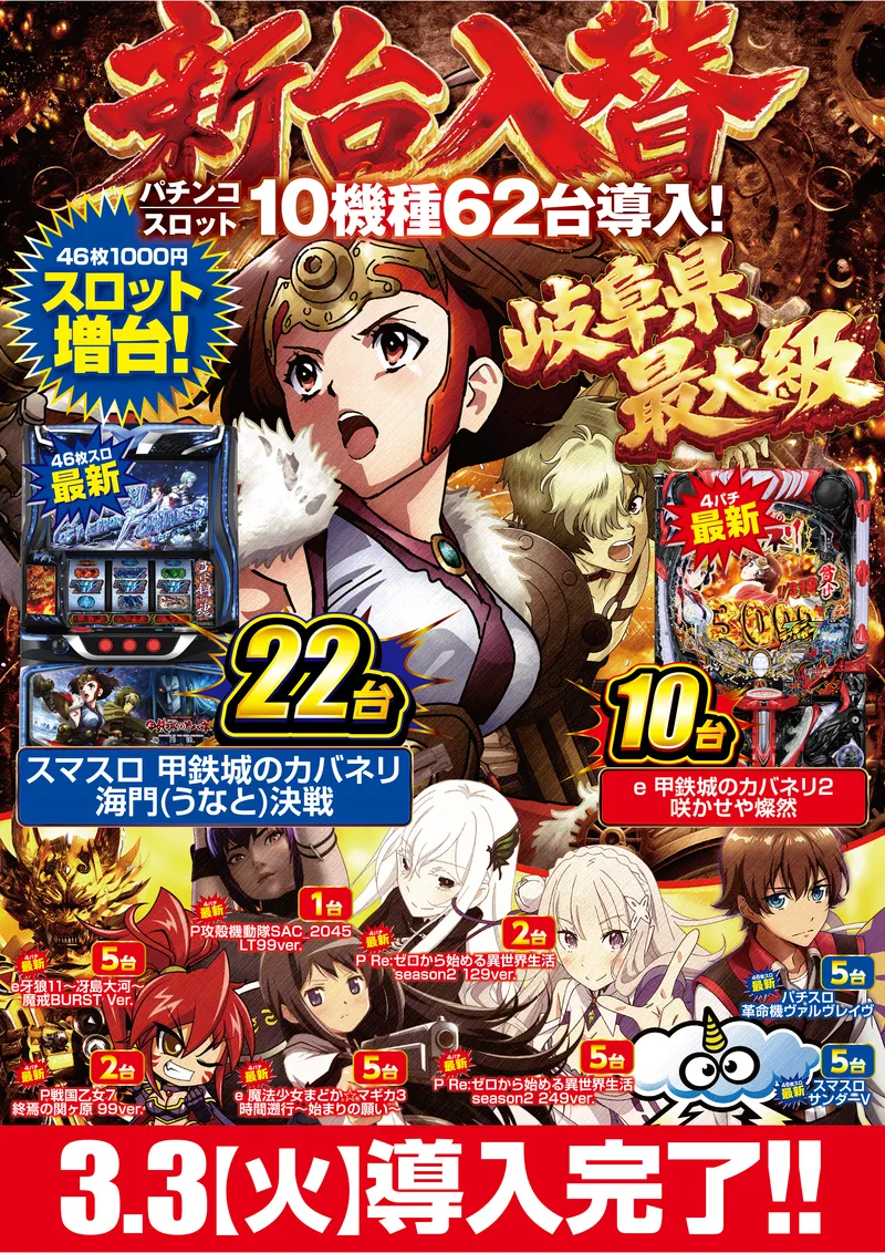 STORE INTRODUCTION 大垣店 NEW MACHINE 新台入替のご案内 3月3日(火)朝9時オープン! 10機種62台導入! SCHEDULE スケジュール キャッスルグループ全店3月11日水曜日朝9時オープン MENU 今月のメニュー 01 新台入替 これが最新導入機種だぁぁぁ! 02 オススメ機種 これが面白い!当店オススメはコレ! 03 機種ラインナップ 選べる楽しさ!設置機種情報はこちら! 04 台データ 当日データをチェック 05 入場方法 入場抽選時間や開店時間をチェック! 06 来店情報 有名人・インフルエンサー来店はこちら 07 厳選賞品・総付景品案内 厳選賞品や無料配布をGET! 08 基本情報・アクセス Let′s Go! 09 設備・サービス 快適遊空間! 各店舗の最新情報やイメージキャラクター吉沢朱音の情報など盛り沢山でおとどけ! MENU メニュー 01 新台入替 02 オススメ機種 03 機種ラインナップ 04 台データ 05 入場案内 06 来店情報 07 厳選賞品・総付景品案内 08 基本情報・アクセス 09 設備・サービス