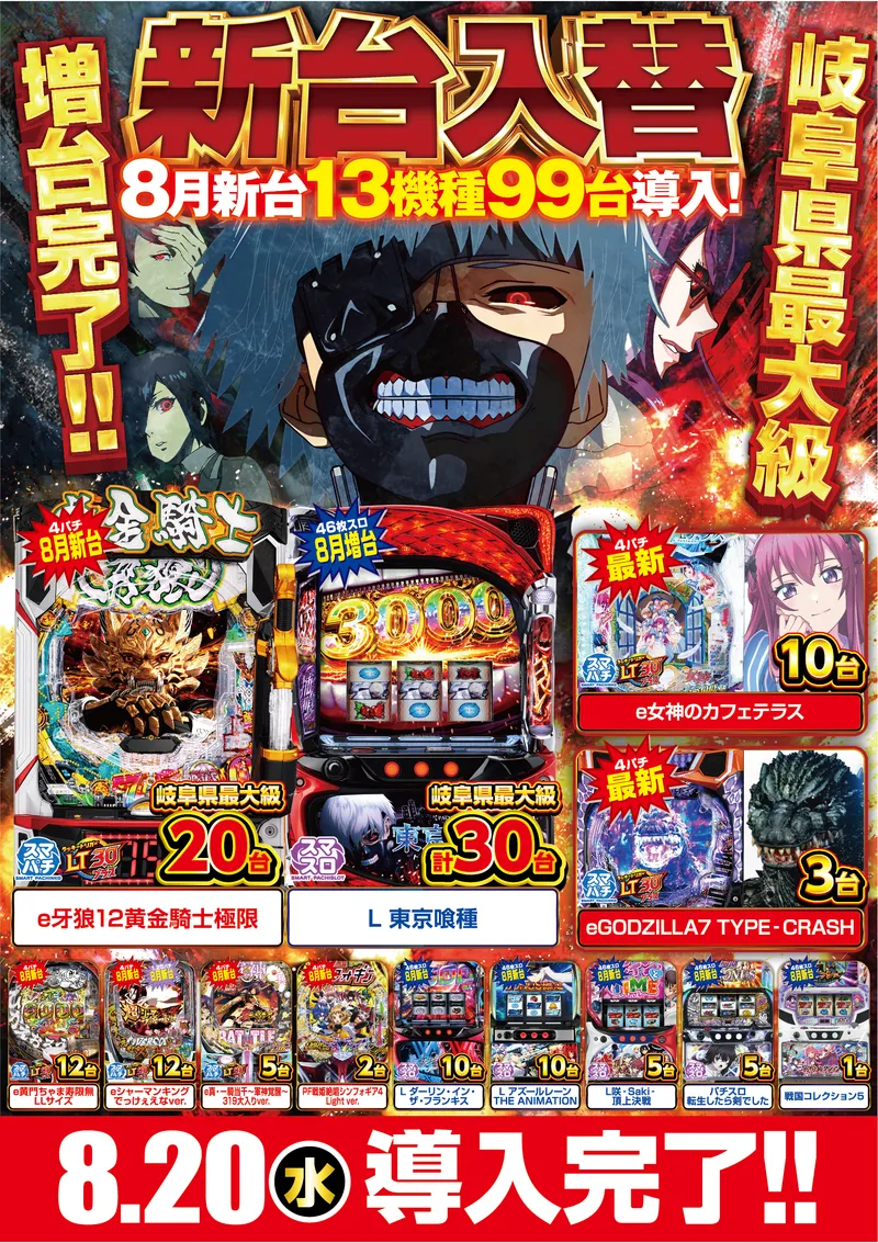 トップ_8/31 18:00 2025 8/31 STORE INTRODUCTION 大垣店 NEW MACHINE 新台入替のご案内 8月20日(水)朝9時オープン! 2機種13台導入! SCHEDULE スケジュール キャッスルグループ全店9月3日水曜日朝9時オープン MENU 今月のメニュー 01 新台入替 これが最新導入機種だぁぁぁ! 02 オススメ機種 これが面白い!当店オススメはコレ! 03 機種ラインナップ 選べる楽しさ!設置機種情報はこちら! 04 台データ 当日データをチェック 05 入場方法 入場抽選時間や開店時間をチェック! 06 来店情報 有名人・インフルエンサー来店はこちら 07 厳選賞品・総付景品案内 厳選賞品や無料配布をGET! 08 基本情報・アクセス Let′s Go! 09 設備・サービス 快適遊空間! 各店舗の最新情報やイメージキャラクター吉沢朱音の情報など盛り沢山でおとどけ! MENU メニュー 01 新台入替 02 オススメ機種 03 機種ラインナップ 04 台データ 05 入場案内 06 来店情報 07 厳選賞品・総付景品案内 08 基本情報・アクセス 09 設備・サービス トップ