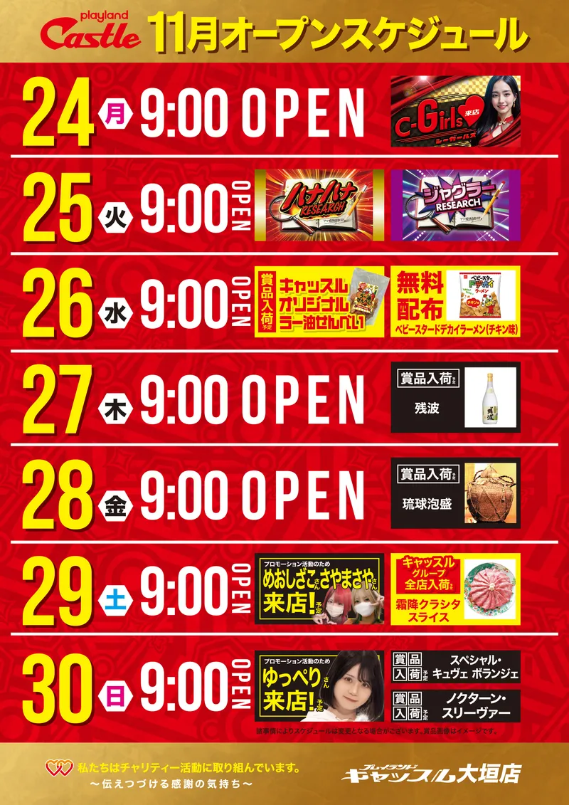 トップ_11/29 18:00 2025 11/29 STORE INTRODUCTION 大垣店 NEW MACHINE 新台入替のご案内 11月19日(水)朝9時オープン! 11機種32台導入! SCHEDULE スケジュール キャッスルグループ全店12月3日水曜日朝9時オープン MENU 今月のメニュー 01 新台入替 これが最新導入機種だぁぁぁ! 02 オススメ機種 これが面白い!当店オススメはコレ! 03 機種ラインナップ 選べる楽しさ!設置機種情報はこちら! 04 台データ 当日データをチェック 05 入場方法 入場抽選時間や開店時間をチェック! 06 来店情報 有名人・インフルエンサー来店はこちら 07 厳選賞品・総付景品案内 厳選賞品や無料配布をGET! 08 基本情報・アクセス Let′s Go! 09 設備・サービス 快適遊空間! 各店舗の最新情報やイメージキャラクター吉沢朱音の情報など盛り沢山でおとどけ! MENU メニュー 01 新台入替 02 オススメ機種 03 機種ラインナップ 04 台データ 05 入場案内 06 来店情報 07 厳選賞品・総付景品案内 08 基本情報・アクセス 09 設備・サービス トップ