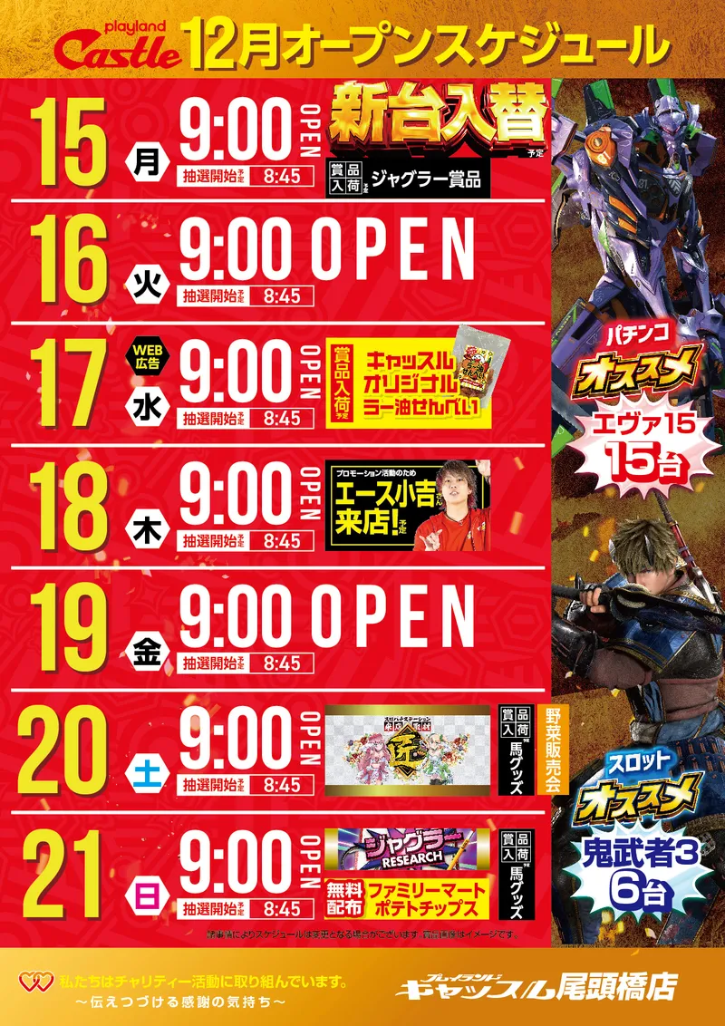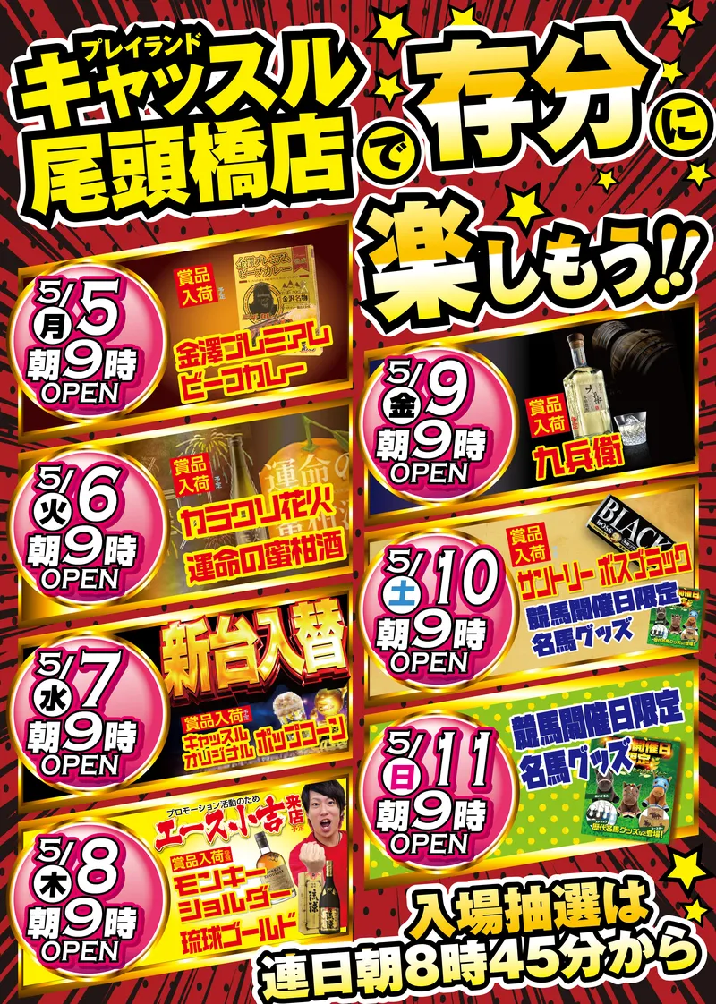 STORE INTRODUCTION 尾頭橋店 NEW MACHINE 新台入替のご案内 12月15日(月)朝9時オープン! 24機種33台 一挙導入 SCHEDULE 今月の賞品入荷スケジュール キャッスルグループ全店12月17日水曜日朝9時オープン MENU 今月のメニュー 01 新台入替 これが最新導入機種だぁぁぁ! 02 オススメ機種 これが面白い!当店オススメはコレ! 03 機種ラインナップ 選べる楽しさ!設置機種情報はこちら! 04 ランキング&台データ 月間ランキングや当日データをチェック 05 入場方法 入場抽選時間や開店時間をチェック! 06 来店情報 有名人・インフルエンサー来店はこちら 07 厳選賞品・総付景品案内 厳選賞品や無料配布をGET! 08 ポイント景品入荷 ポイ活してゲット! 09 基本情報・アクセス Let′s Go! 10 設備・サービス 快適遊空間! 各店舗の最新情報やイメージキャラクター吉沢朱音の情報など盛り沢山でおとどけ! MENU メニュー 01 新台入替 02 オススメ機種 03 機種ラインナップ 04 ランキング&台データ 05 入場案内 06 来店情報 07 厳選賞品・総付景品案内 08 ポイント景品入荷 10 基本情報・アクセス 11 設備・サービス