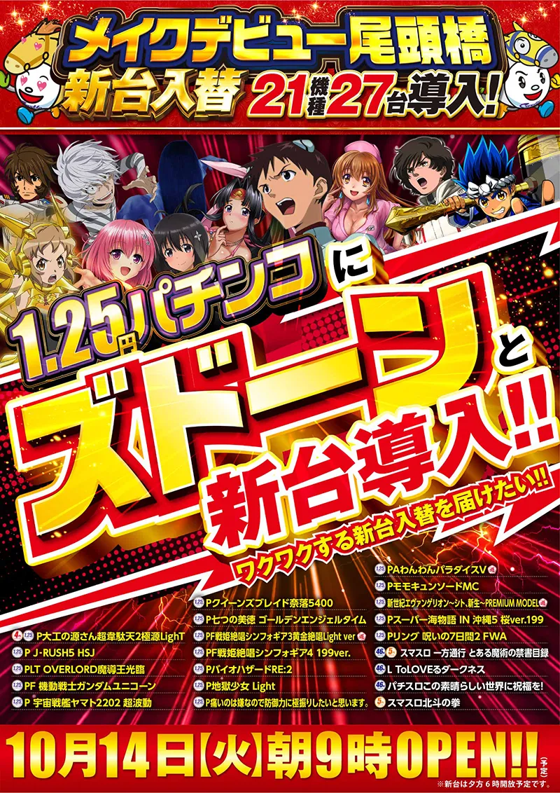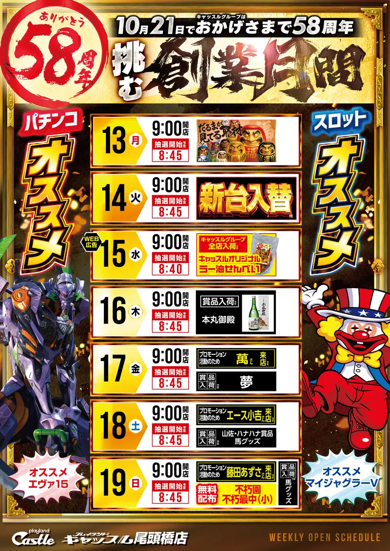 STORE INTRODUCTION 尾頭橋店 NEW MACHINE 新台入替のご案内 10月14日(火)朝9時オープン! 21機種27台 一挙導入 SCHEDULE 今月の賞品入荷スケジュール キャッスルグループ全店10月22日水曜日朝9時オープン MENU 今月のメニュー 01 新台入替 これが最新導入機種だぁぁぁ! 02 オススメ機種 これが面白い!当店オススメはコレ! 03 機種ラインナップ 選べる楽しさ!設置機種情報はこちら! 04 ランキング&台データ 月間ランキングや当日データをチェック 05 入場方法 入場抽選時間や開店時間をチェック! 06 来店情報 有名人・インフルエンサー来店はこちら 07 厳選賞品・総付景品案内 厳選賞品や無料配布をGET! 08 ポイント景品入荷 ポイ活してゲット! 09 基本情報・アクセス Let′s Go! 10 設備・サービス 快適遊空間! 各店舗の最新情報やイメージキャラクター吉沢朱音の情報など盛り沢山でおとどけ! MENU メニュー 01 新台入替 02 オススメ機種 03 機種ラインナップ 04 ランキング&台データ 05 入場案内 06 来店情報 07 厳選賞品・総付景品案内 08 ポイント景品入荷 10 基本情報・アクセス 11 設備・サービス