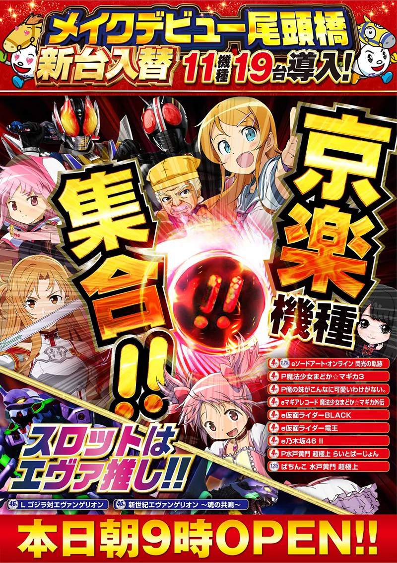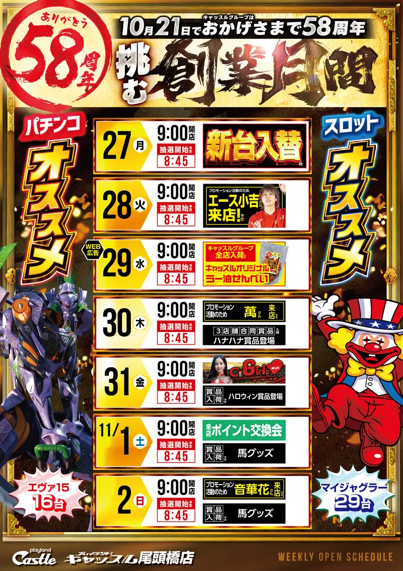 STORE INTRODUCTION 尾頭橋店 NEW MACHINE 新台入替のご案内 10月27日(月)朝9時オープン! 11機種19台 一挙導入 SCHEDULE 今月の賞品入荷スケジュール キャッスルグループ全店11月5日水曜日朝9時オープン MENU 今月のメニュー 01 新台入替 これが最新導入機種だぁぁぁ! 02 オススメ機種 これが面白い!当店オススメはコレ! 03 機種ラインナップ 選べる楽しさ!設置機種情報はこちら! 04 ランキング&台データ 月間ランキングや当日データをチェック 05 入場方法 入場抽選時間や開店時間をチェック! 06 来店情報 有名人・インフルエンサー来店はこちら 07 厳選賞品・総付景品案内 厳選賞品や無料配布をGET! 08 ポイント景品入荷 ポイ活してゲット! 09 基本情報・アクセス Let′s Go! 10 設備・サービス 快適遊空間! 各店舗の最新情報やイメージキャラクター吉沢朱音の情報など盛り沢山でおとどけ! MENU メニュー 01 新台入替 02 オススメ機種 03 機種ラインナップ 04 ランキング&台データ 05 入場案内 06 来店情報 07 厳選賞品・総付景品案内 08 ポイント景品入荷 10 基本情報・アクセス 11 設備・サービス
