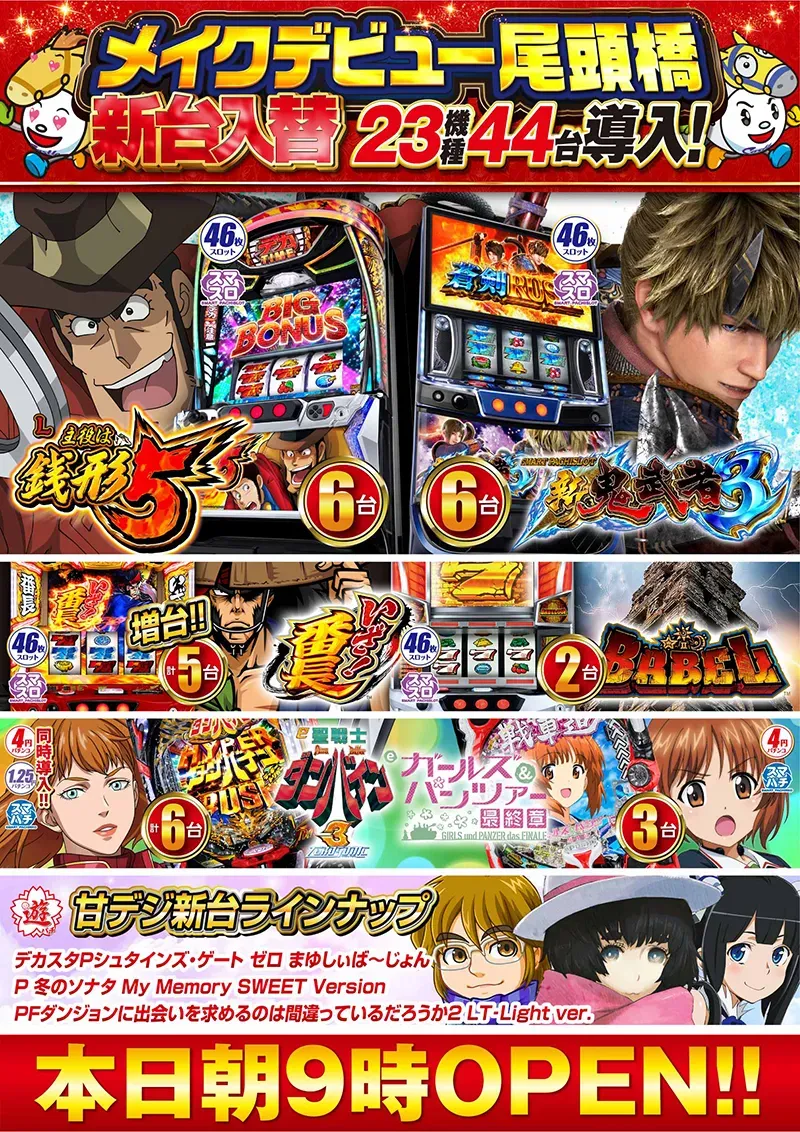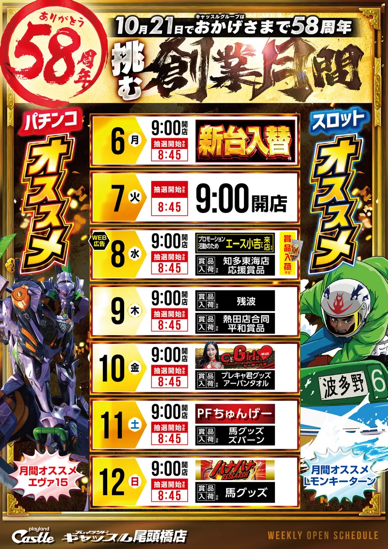 STORE INTRODUCTION 尾頭橋店 NEW MACHINE 新台入替のご案内 10月6日(月)朝9時オープン! 23機種44台 一挙導入 SCHEDULE 今月の賞品入荷スケジュール キャッスルグループ全店10月15日水曜日朝9時オープン MENU 今月のメニュー 01 新台入替 これが最新導入機種だぁぁぁ! 02 オススメ機種 これが面白い!当店オススメはコレ! 03 機種ラインナップ 選べる楽しさ!設置機種情報はこちら! 04 ランキング&台データ 月間ランキングや当日データをチェック 05 入場方法 入場抽選時間や開店時間をチェック! 06 来店情報 有名人・インフルエンサー来店はこちら 07 厳選賞品・総付景品案内 厳選賞品や無料配布をGET! 08 ポイント景品入荷 ポイ活してゲット! 09 基本情報・アクセス Let′s Go! 10 設備・サービス 快適遊空間! 各店舗の最新情報やイメージキャラクター吉沢朱音の情報など盛り沢山でおとどけ! MENU メニュー 01 新台入替 02 オススメ機種 03 機種ラインナップ 04 ランキング&台データ 05 入場案内 06 来店情報 07 厳選賞品・総付景品案内 08 ポイント景品入荷 10 基本情報・アクセス 11 設備・サービス