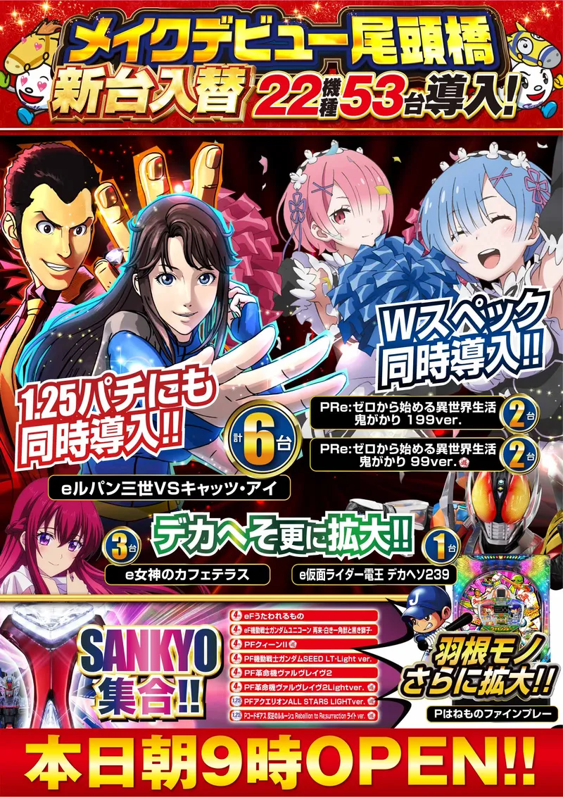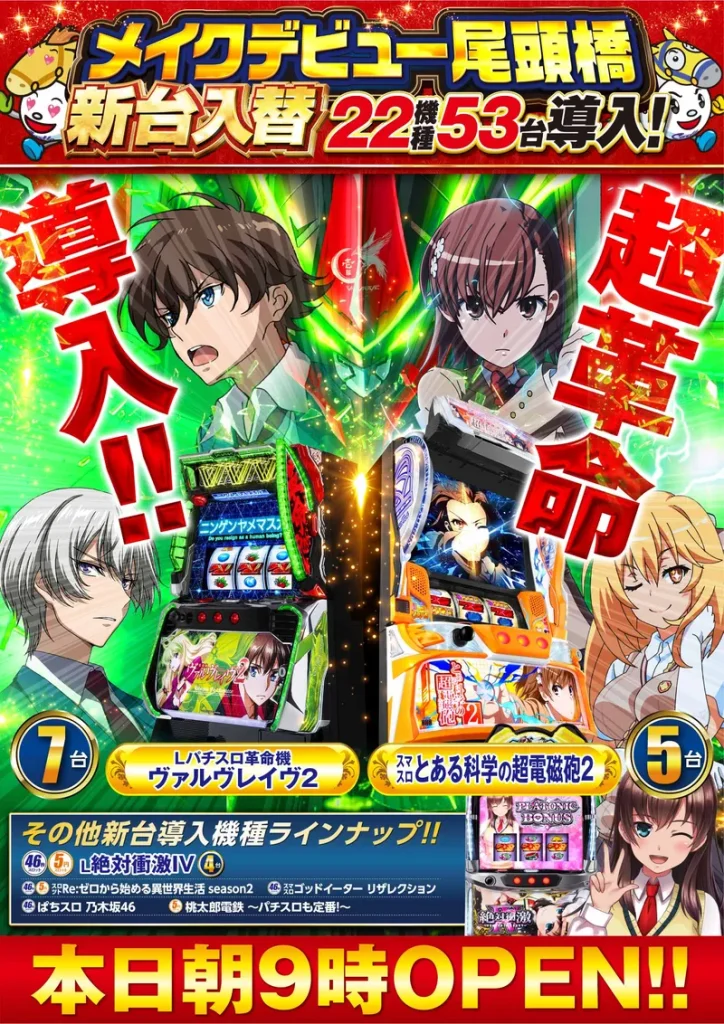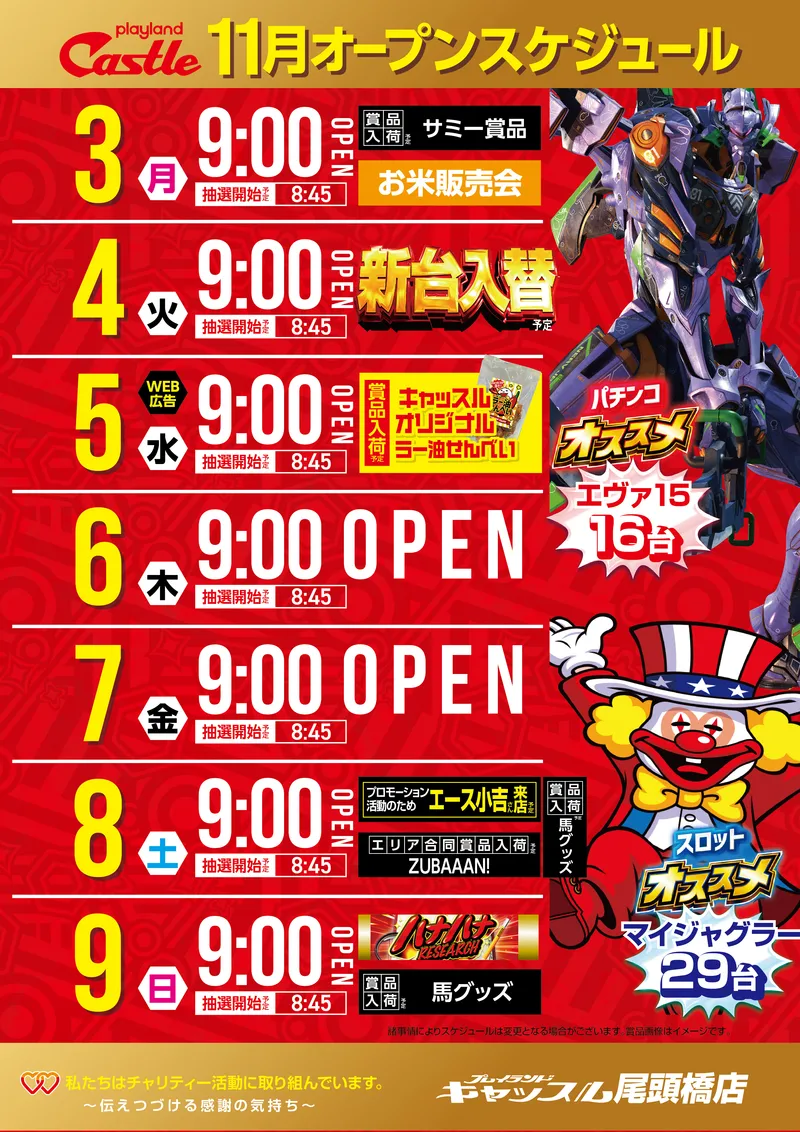 STORE INTRODUCTION 尾頭橋店 NEW MACHINE 新台入替のご案内 11月4日(火)朝9時オープン! 22機種53台 一挙導入 SCHEDULE 今月の賞品入荷スケジュール キャッスルグループ全店11月5日水曜日朝9時オープン MENU 今月のメニュー 01 新台入替 これが最新導入機種だぁぁぁ! 02 オススメ機種 これが面白い!当店オススメはコレ! 03 機種ラインナップ 選べる楽しさ!設置機種情報はこちら! 04 ランキング&台データ 月間ランキングや当日データをチェック 05 入場方法 入場抽選時間や開店時間をチェック! 06 来店情報 有名人・インフルエンサー来店はこちら 07 厳選賞品・総付景品案内 厳選賞品や無料配布をGET! 08 ポイント景品入荷 ポイ活してゲット! 09 基本情報・アクセス Let′s Go! 10 設備・サービス 快適遊空間! 各店舗の最新情報やイメージキャラクター吉沢朱音の情報など盛り沢山でおとどけ! MENU メニュー 01 新台入替 02 オススメ機種 03 機種ラインナップ 04 ランキング&台データ 05 入場案内 06 来店情報 07 厳選賞品・総付景品案内 08 ポイント景品入荷 10 基本情報・アクセス 11 設備・サービス