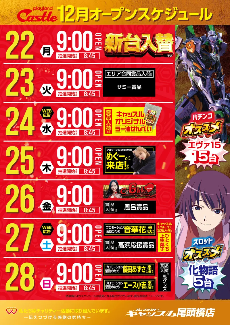 STORE INTRODUCTION 尾頭橋店 NEW MACHINE 新台入替のご案内 12月22日(月)朝9時オープン! 25機種54台 一挙導入 SCHEDULE 今月の賞品入荷スケジュール キャッスルグループ全店12月31日水曜日朝9時オープン MENU 今月のメニュー 01 新台入替 これが最新導入機種だぁぁぁ! 02 オススメ機種 これが面白い!当店オススメはコレ! 03 機種ラインナップ 選べる楽しさ!設置機種情報はこちら! 04 ランキング&台データ 月間ランキングや当日データをチェック 05 入場方法 入場抽選時間や開店時間をチェック! 06 来店情報 有名人・インフルエンサー来店はこちら 07 厳選賞品・総付景品案内 厳選賞品や無料配布をGET! 08 ポイント景品入荷 ポイ活してゲット! 09 基本情報・アクセス Let′s Go! 10 設備・サービス 快適遊空間! 各店舗の最新情報やイメージキャラクター吉沢朱音の情報など盛り沢山でおとどけ! MENU メニュー 01 新台入替 02 オススメ機種 03 機種ラインナップ 04 ランキング&台データ 05 入場案内 06 来店情報 07 厳選賞品・総付景品案内 08 ポイント景品入荷 10 基本情報・アクセス 11 設備・サービス
