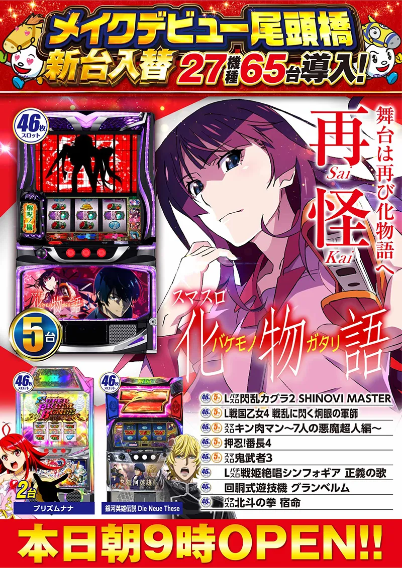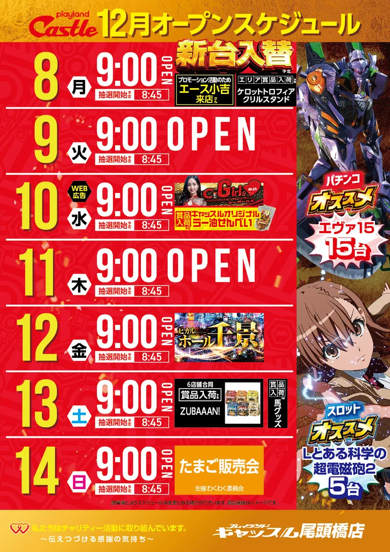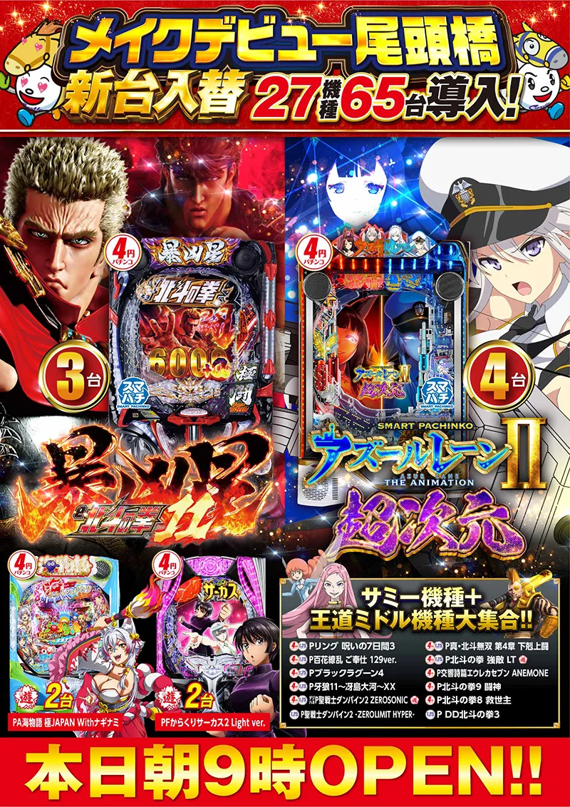 STORE INTRODUCTION 尾頭橋店 NEW MACHINE 新台入替のご案内 12月8日(月)朝9時オープン! 27機種65台 一挙導入 SCHEDULE 今月の賞品入荷スケジュール キャッスルグループ全店12月17日水曜日朝9時オープン MENU 今月のメニュー 01 新台入替 これが最新導入機種だぁぁぁ! 02 オススメ機種 これが面白い!当店オススメはコレ! 03 機種ラインナップ 選べる楽しさ!設置機種情報はこちら! 04 ランキング&台データ 月間ランキングや当日データをチェック 05 入場方法 入場抽選時間や開店時間をチェック! 06 来店情報 有名人・インフルエンサー来店はこちら 07 厳選賞品・総付景品案内 厳選賞品や無料配布をGET! 08 ポイント景品入荷 ポイ活してゲット! 09 基本情報・アクセス Let′s Go! 10 設備・サービス 快適遊空間! 各店舗の最新情報やイメージキャラクター吉沢朱音の情報など盛り沢山でおとどけ! MENU メニュー 01 新台入替 02 オススメ機種 03 機種ラインナップ 04 ランキング&台データ 05 入場案内 06 来店情報 07 厳選賞品・総付景品案内 08 ポイント景品入荷 10 基本情報・アクセス 11 設備・サービス